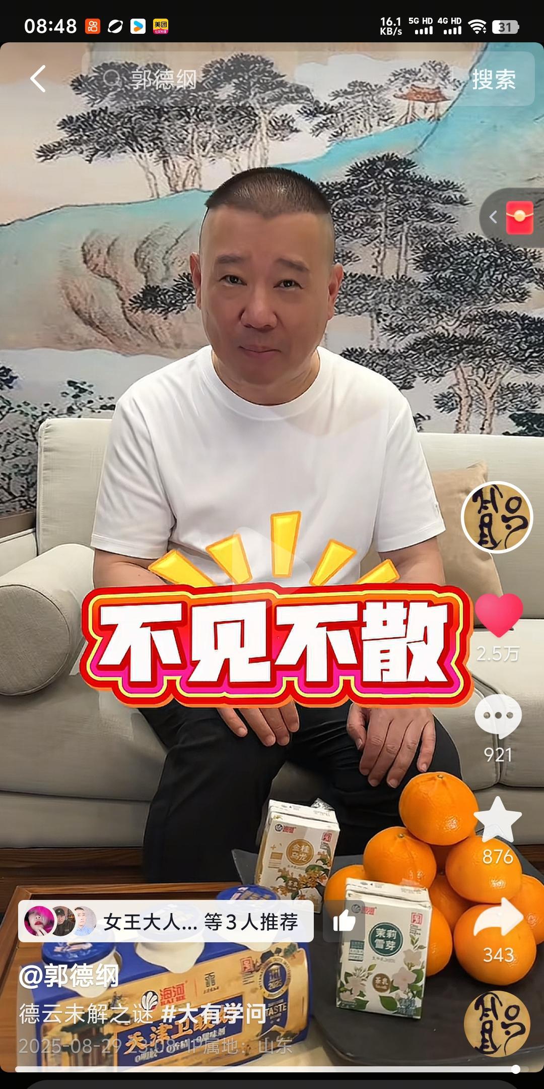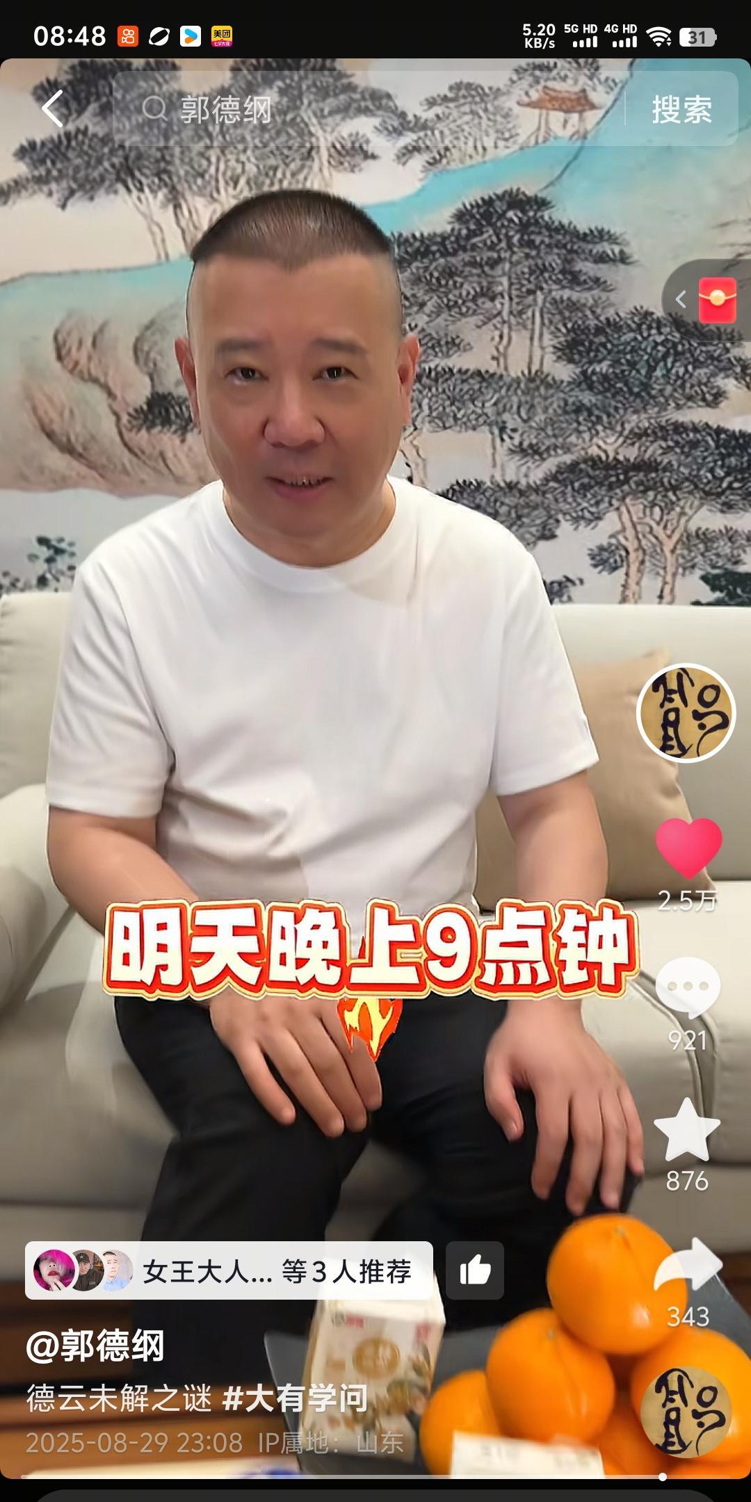 郭德纲昨晚深夜发视频,说有朋友问他,听说有人管“相声”这一行叫做“江湖”? 郭德纲表示,老年间把相声叫做江湖,是因为干这行不容易,行走“江湖”要胆大心细,菩萨心肠,雷霆手段,心中有佛,受众有刀,人生最高境界不是非得把谁打败了,非得打赢了。 人生的最高境界是要让对方在你的节奏里迷路。 假如看完你还不明白这段话什么意思呢?别着急,郭德纲说了。 今晚九点钟,也就是8月30号晚上9点,他会开抖音直播解释。 您要不来啊?他就不走... 我尝试去理解老郭这段的意思,大概呢,就是干相声演员的,都不是什么大老粗,都是很会勾心斗角的“角”,您要在这个行业里打拼呢,就要做到面面俱到,有能力之余呢,还要懂得帮扶别人,帮扶别人的同时,还要小心别人来“暗算你”,最后呢... 不是一定要赢过谁,就是做好自己,走好自己踏出来的路,让别人跟着你的脚步走... 晚上九点,郭德纲直播间,不见不散。(我买的相声演义到了,下午来晒书。) #视频转图文大赛#