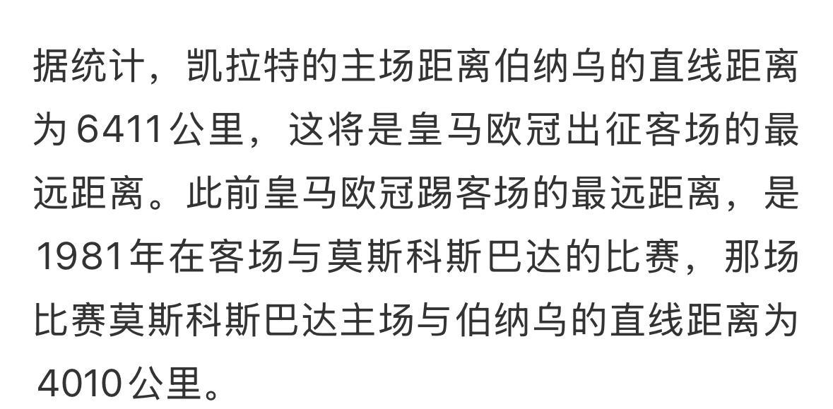 皇马:欧冠客场作战最远直线距离从4010公里到6411公里,足足用了44年的时间。 从1981年最远客场莫斯科到2025年的客场阿拉木图, 1981年的对手是莫斯科斯巴达队,2025年的对手是来自哈萨克斯坦的阿拉木图凯拉特队。 当然,这也是与身处亚洲版图却加入欧足联的哈萨克斯坦足协密切相关。 要不是这种情况,皇马的欧冠最远客场纪录估计就定格在了莫斯科了。