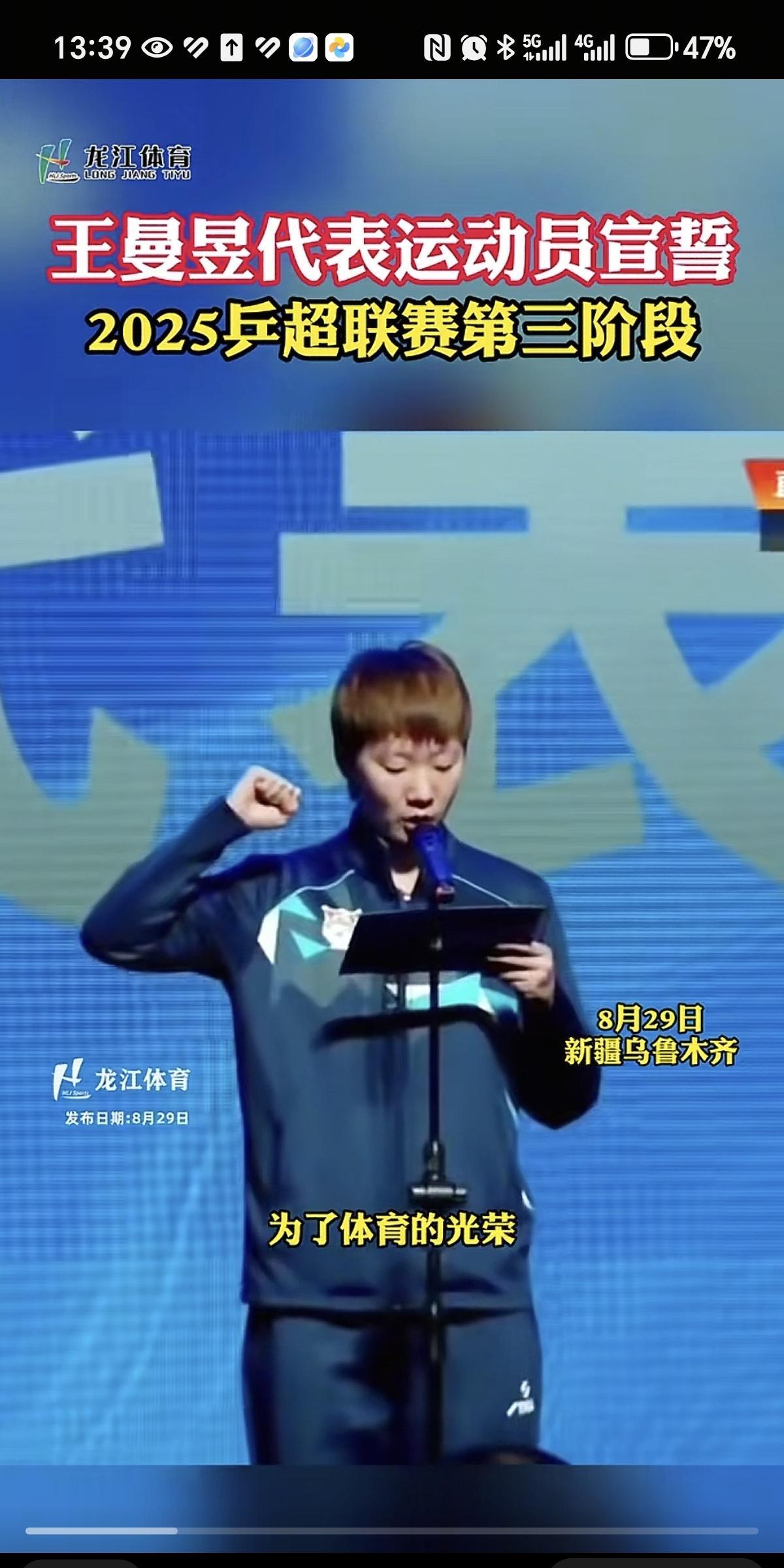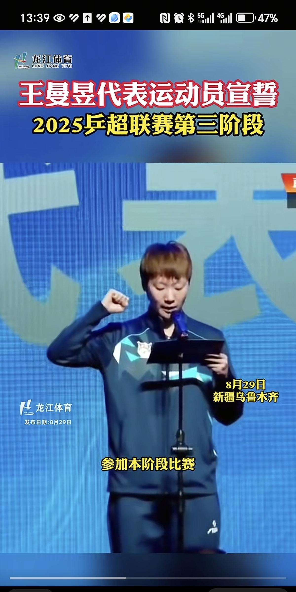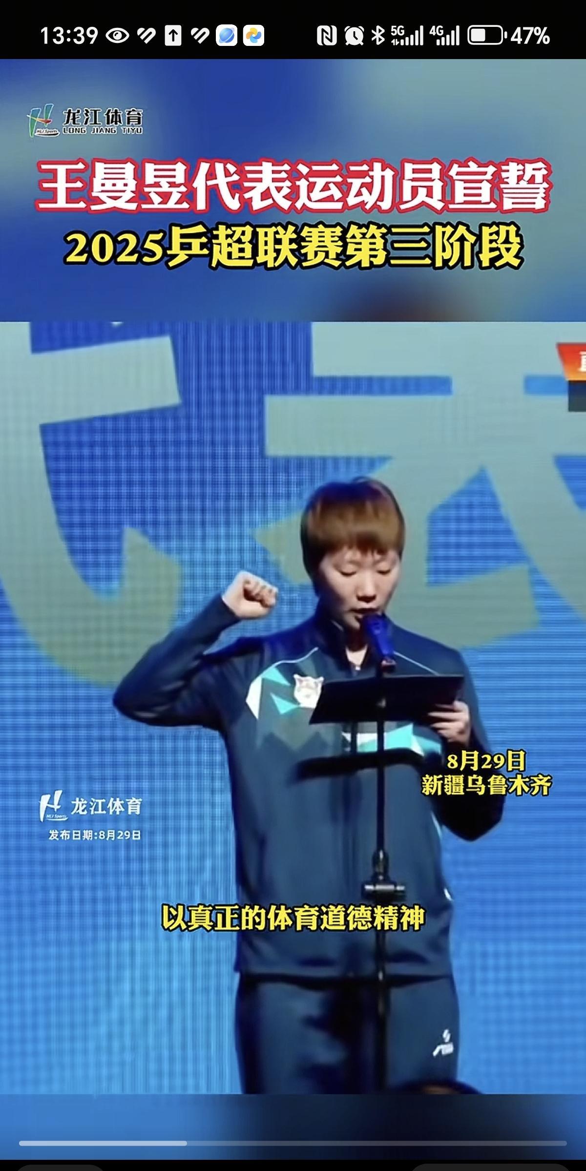 08月29日,王曼昱荣幸当选代表运动员宣誓,这是王曼昱人品和球品两者相结合的精髓,真是天选之人,组委会真是太有眼光了 王曼昱穿着俱乐部队服,一身正气,自信又霸气的走上台,代表运动员宣誓,标准的右手握拳,像军人一样挺拔的身姿,字字铿锵,充分体现了当代体育精神和气质。 王曼昱宣誓词讲到: 以真正的体育道德精神,参加本阶段比赛,尊重并遵守比赛的各项规则 王曼昱在赛场上,打最纯粹和干净的球,希望在乒超第三阶段新疆站能发挥出正常水平,顺祝:七夕节快乐!