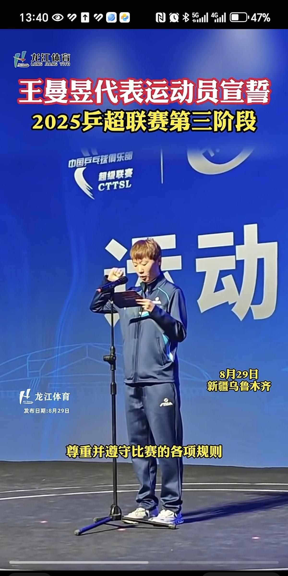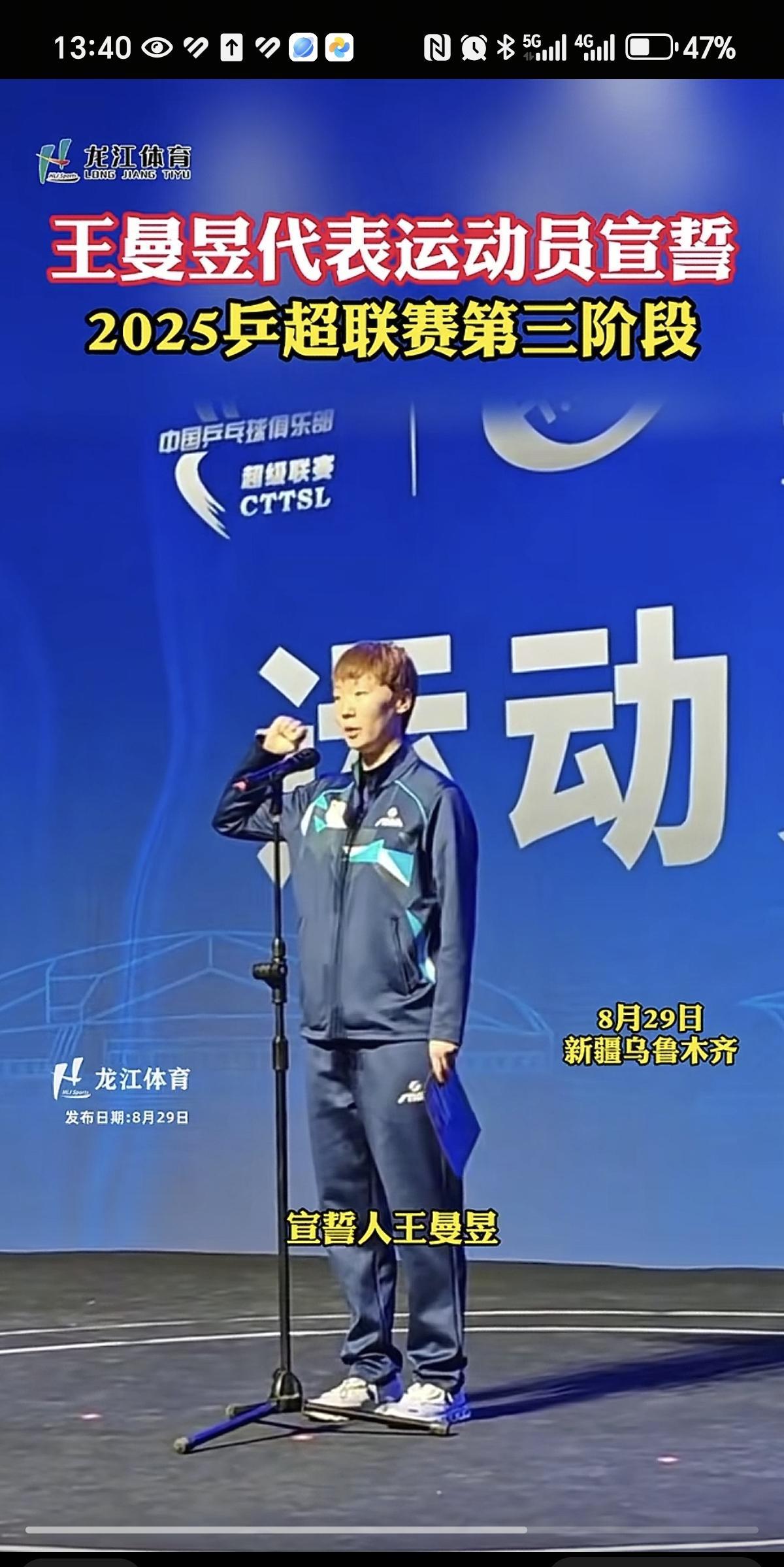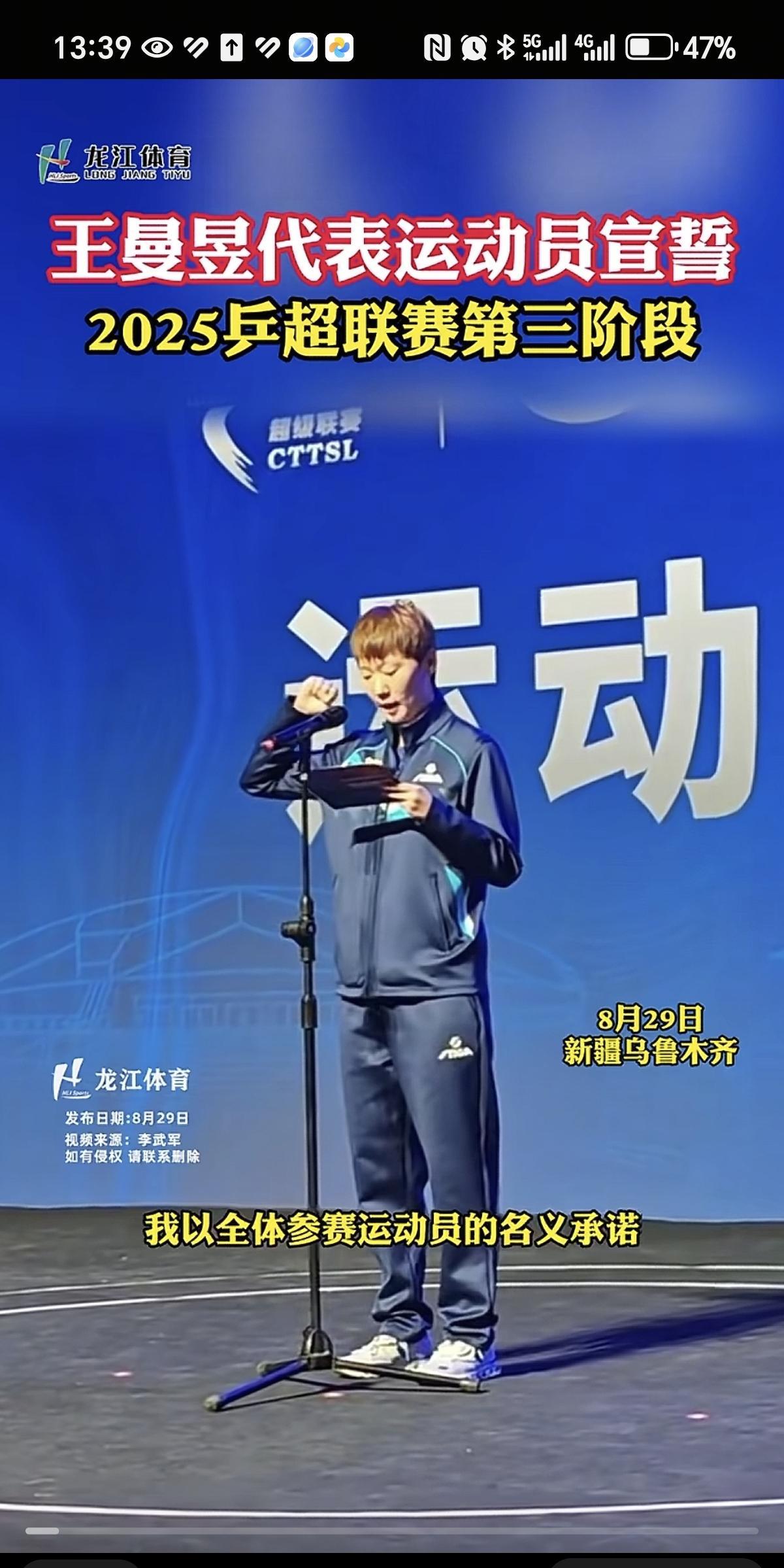 08月29日,王曼昱荣幸当选代表运动员宣誓,这是王曼昱人品和球品两者相结合的精髓,真是天选之人,组委会真是太有眼光了 王曼昱穿着俱乐部队服,一身正气,自信又霸气的走上台,代表运动员宣誓,标准的右手握拳,像军人一样挺拔的身姿,字字铿锵,充分体现了当代体育精神和气质。 王曼昱宣誓词讲到: 以真正的体育道德精神,参加本阶段比赛,尊重并遵守比赛的各项规则 王曼昱在赛场上,打最纯粹和干净的球,希望在乒超第三阶段新疆站能发挥出正常水平,顺祝:七夕节快乐!