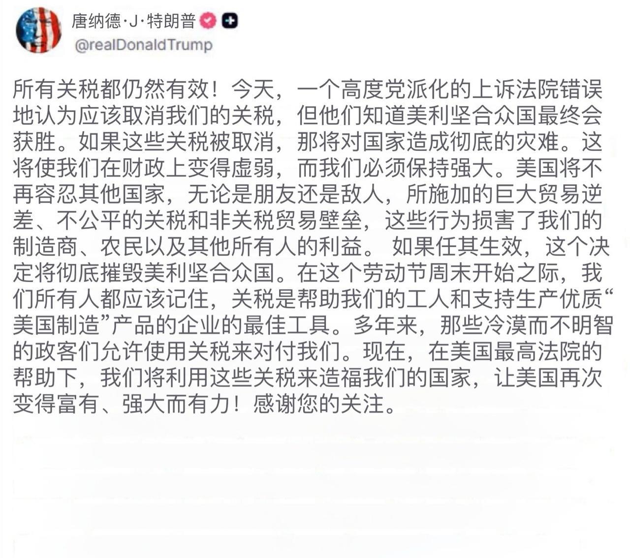 美上诉法院裁定特朗普关税违法 美国联邦巡回上诉法院7比4裁定,特朗普依据《国际紧急经济权力法》对多国加征的“互惠”关税及对中国、墨西哥、加拿大额外关税违法,关税立法权属国会;裁决10月14日生效,政府可上诉最高法院,在此期间,关税仍然有效。特朗普称裁决“毁灭美国”。 多数人写道:“因为我们同意“国际紧急经济权力法”授予总统'监管'进口的权力并不授权行政命令征收的关税,我们确认。” 该决定实际上为最高法院提出了关于总统在贸易政策方面的权力范围的最重要的法律问题之一。 10月14日之后,法院将把案件退回下级法院,以决定最高法院最近限制全国禁令的裁决如何影响该裁决。