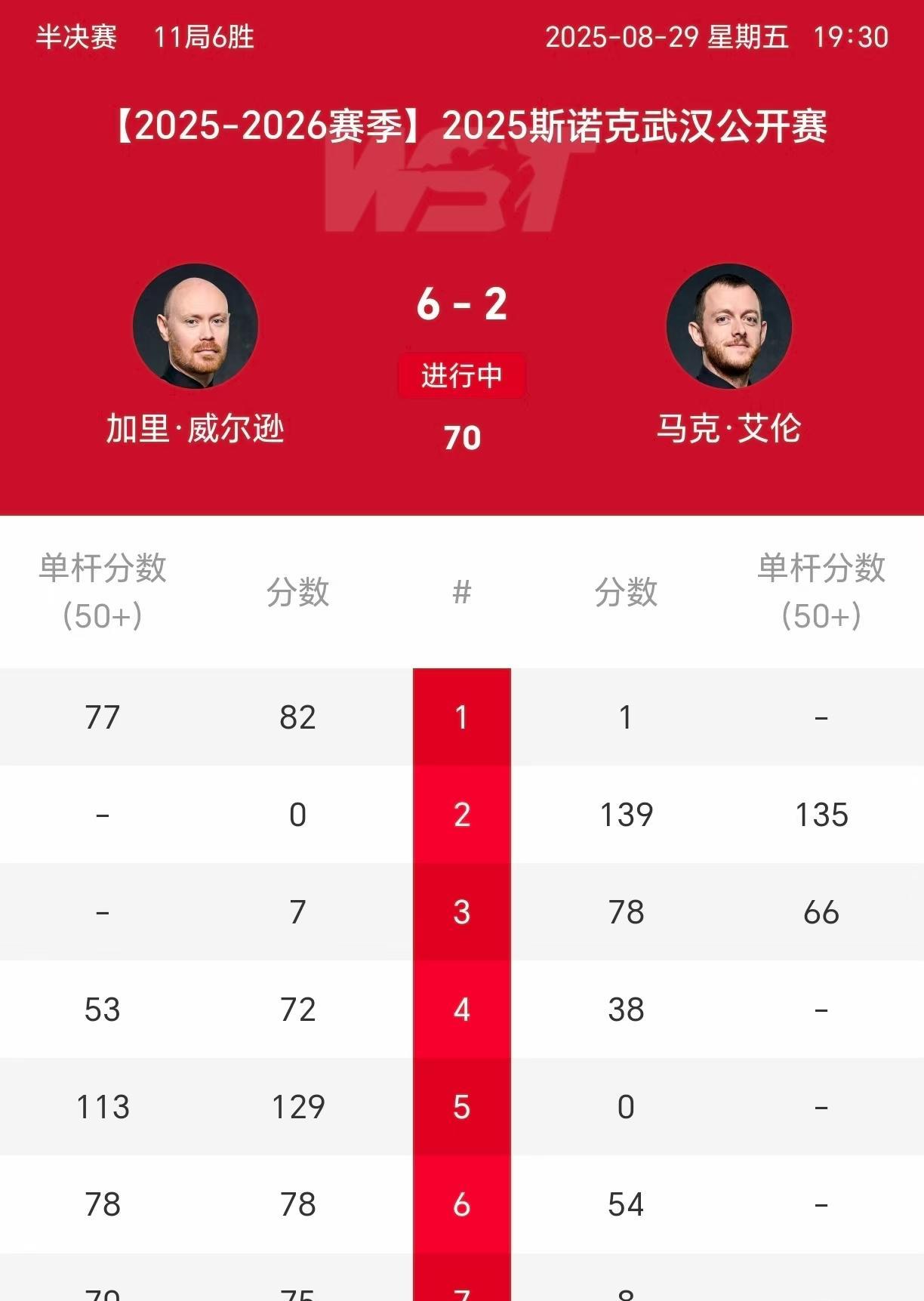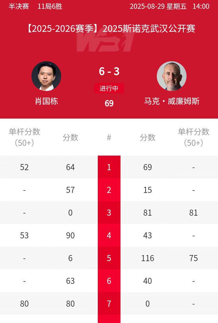 肖国栋晋级决赛一路顺风顺水,半决赛之前基本上没有遇到像样的对手,打老马那一场倒是比较硬,也正好赶上了老头子不太准,连点位清彩都失误。威尔逊一路晋级不容易,后四轮碰到的都是顶级高手,每一个人都有夺冠的实力。本来还想着艾伦和威尔逊能够多纠缠两个小时,夜熬深了明天或许精力不济,没想到下半场回来艾伦净吞4蛋。综合现在的情况来看,肖国栋卫冕的可能性越来越大了。 肖国栋的晋级之路: 5:0泰妹旺哈 5:2查达 5:3大卫-格雷斯 5:2马修-塞尔特 5:2斯坦-穆迪 6:3马克-威廉姆斯 加里-威尔逊的晋级之路: 5:2高阳 5:0吕昊天 5:3肖恩-墨菲 5:4特鲁姆普 5:2约翰-希金斯 6:2马克-艾伦