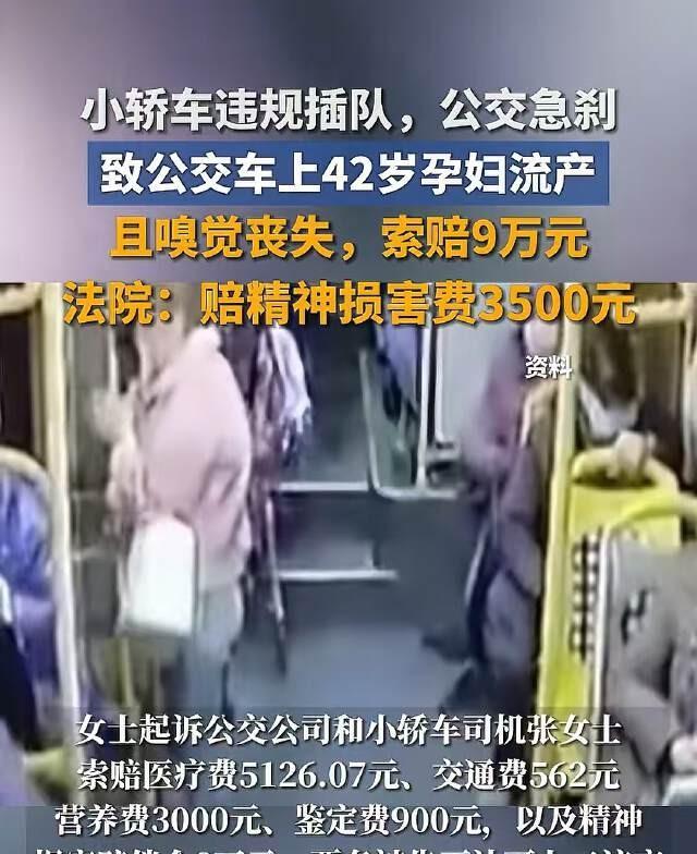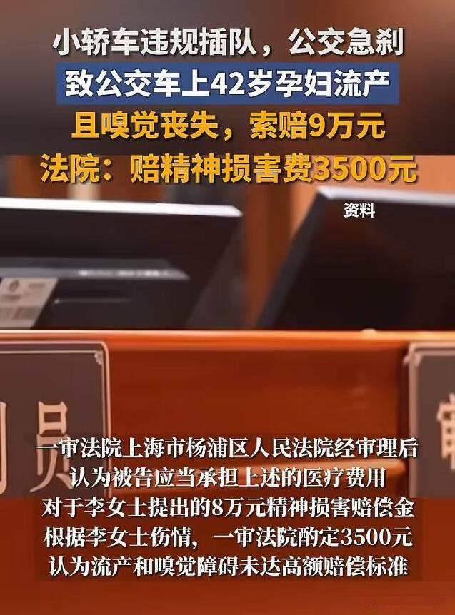 女乘客因急刹车摔伤头部,去医院检查却意外发现已经怀孕6周,已经42岁的她还来不及思考喜悦,却因面临一系列的检查与药物治疗要被迫流产。而头部损伤也导致了她的嗅觉产生障碍。这位乘客索赔精神损害赔偿金8万元,而法院最后只判了3500元。 事情发生在上海,那时正是下班高峰的时候,这位女乘客像往常一样乘坐公共汽车。 下班高峰,正是车多人多的时候,这时在公交车前面有一个轿车违规插队,为避免发生碰撞,司机立即刹车,由于刹车产生的惯性,让一时不防的女乘客摔倒。 不幸运的是,该乘客还摔伤了头部。 根据《民法典》第一百八十二条,规定:因紧急避险造成损害的,由引起险情发生的人承担民事责任。 危险由自然原因引起的,紧急避险人不承担民事责任,可以给予适当补偿。 紧急避险采取措施不当或者超过必要的限度,造成不应有的损害的,紧急避险人应当承担适当的民事责任。 公交车司机急刹车的行为,是为避免违规插队的轿车造成,因此,这起事故的民事责任应该让轿车司机承担。 摔伤头部后,这位女乘客前往医院接受检查与治疗。 然而,令人没想到的是,这位42岁的女乘客已经有6周的身孕了,这也让女乘客意外。 不知道对她来说,算不算意外之喜,但是,她接下来还面临着CT检查,这个检查会对胎儿造成影响。 但是不检查,对女乘客的身体安全没有保障,再加上后期还有药物治疗。 种种情况,根本让女乘客无法思考自己实际是否要留下这个孩子,因为现实情况根本没给留下这个孩子提供可能。 最终,这个孩子被流掉了,而且更糟糕的是,因为头部的伤,给女乘客的嗅觉也造成了损伤。 女乘客起诉公交公司和轿车司机,索赔医疗等费用共计9588.07元,另外,还索赔精神损失赔偿金8万元。 法院审理后,支持女乘客医疗等费用的主张,但对于精神失赔偿金,法院只支持赔偿3500元。 对此,李女士当然不服,提起上诉。 但是二审也维持了原判。 《民法典》第一千一百七十九条规定:侵害他人造成人身损害的,应当赔偿医疗费、护理费、交通费、营养费、住院伙食补助费等为治疗和康复支出的合理费用,以及因误工减少的收入。造成残疾的,还应当赔偿辅助器具费和残疾赔偿金;造成死亡的,还应当赔偿丧葬费和死亡赔偿金。 由此可见,女乘客对于医疗等费用的索赔是合理合法的,但因为她并没有索赔残疾赔偿金,可以推断,她嗅觉障碍并不致残。 而且,流产一般不会造成残疾,所以对于流产的赔偿有医疗、误工等费用。 关于精神损害赔偿金的赔偿标准: 一般性精神损害:赔偿金额通常在 2000元到8000元之间,根据侵害的具体情况而定。 严重精神损害:赔偿金额分为 1万元、2万元、3万元、4万元和5万元 五个等级,具体数额根据侵害的严重程度和受害人所承受的精神痛苦来确定。 所以,女乘客主张的8万元精神损害赔偿金不被支持。 对此,你怎么看?请把你的想法分享在评论区吧!