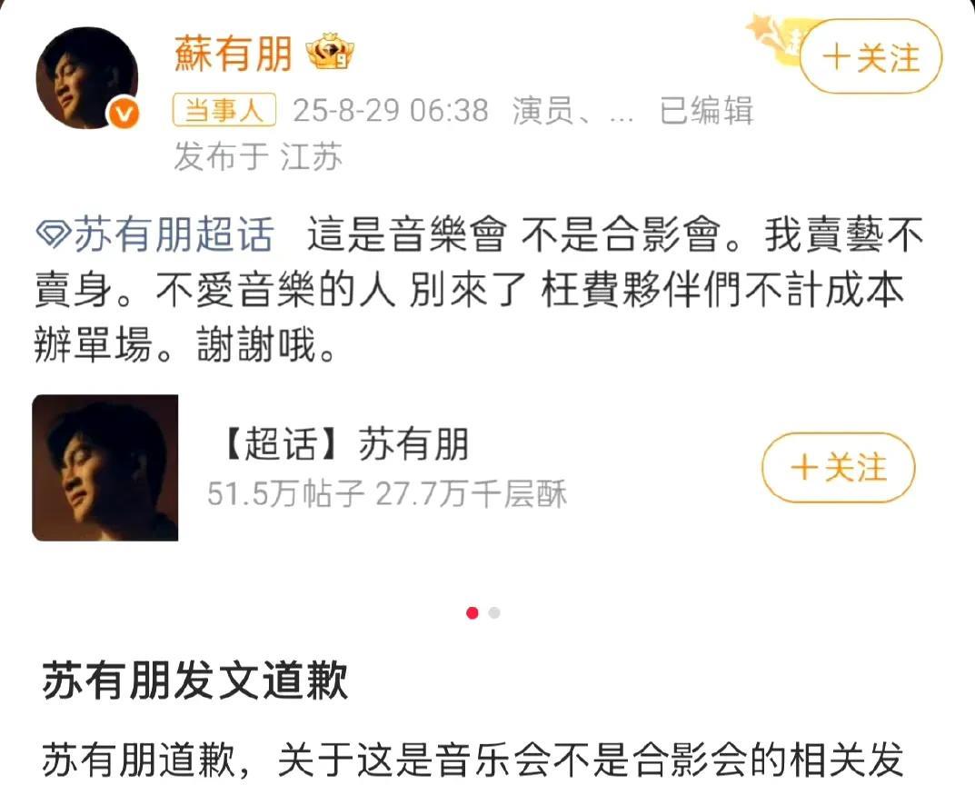 “卖艺不卖身”的苏有朋又“爆火”了! 他开音乐会前宣传买VIP票可以合影,但拒绝