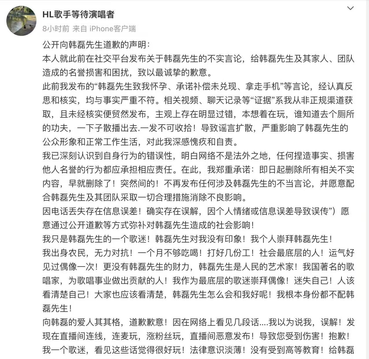 曝料韩磊出轨的当事人道歉了,她说之前发布的关于韩磊先生致我怀孕、承诺补偿未兑现、拿走手机等言论,都与事实严重不符,向韩磊及其家属致以最诚挚的歉意。 当事人说相关视频和聊天记录都是通过非正规渠道获取的,本来就想发着玩玩,没想到一下子就扩散出去了,还造成这么大的影响。 这些视频和聊天记录是怎么来的?为什么又要选择韩磊作为攻击对象?是韩磊报警给当事人带来了压力?还是双方达成了某种协议共识?其中还有很多点没说清楚,只是网友又被他们当成了play的一环而已。