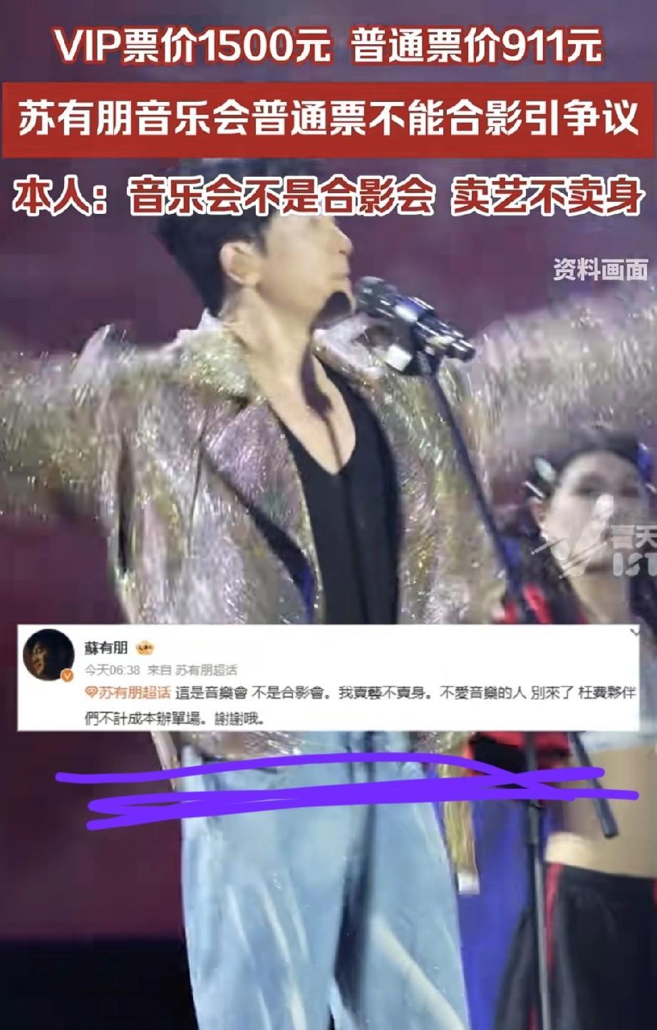 苏有朋演唱会门票,VIP票1500元,普通票900多元。对于普通票不能合影这事引发网友热议。他称这是音乐会不是合影会,还说卖艺不卖身。合个影而已,至于用“卖艺不卖身”来形容吗?不会比喻就别乱比喻! 普通票不能合影就是不卖身,那VIP票能合影就成卖身票了,是这么理解的吗?也不是不能“卖身”,主要是价钱没给够,补上599元差价就行。 人家是喜欢你才来看你演唱会,才想和你合影,你一句“卖艺不卖身”算怎么回事?你该为此感到高兴,还有这么多人喜欢你。等没人愿意和你照相时,你可就真成孤家寡人了。 他太狂了,粉丝可是你的衣食父母,没粉丝捧你,你算什么?卖情怀就好好卖,别整那些高大上的话术。有人愿意买单,也是为自己逝去的青春付费。这下好感全无,又当又立的。虽说这是青春回忆,但把这九百块孝敬父母不好吗?非要去看那老男人。我实在不懂那些追星的人,为啥宁愿花大价钱去看演唱会,免费让我看我都不去。