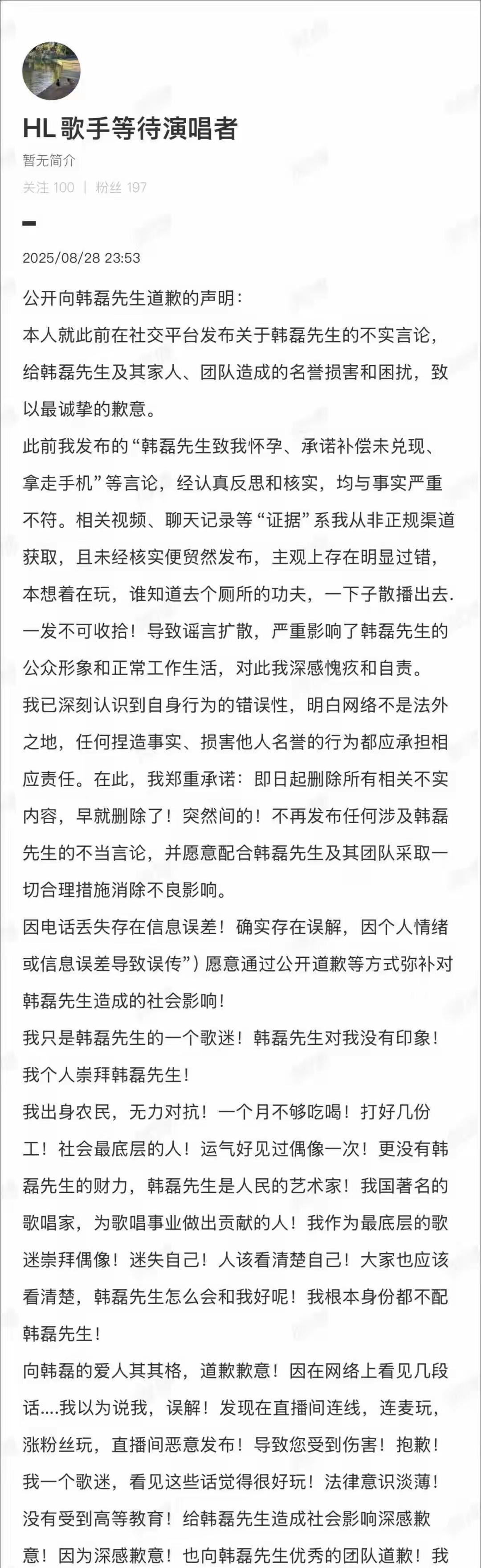 歌手韩磊“骗财骗色”事件没过多久,就出现了惊天大逆转!爆料女的一纸道歉声明让这场风波戛然而止! 吃瓜群众懵逼了! 这到底是“网络碰瓷”背后存在“私下和解”,估计大家猜测不一。 这个爆料女自称初一文凭,可道歉信写的水平挺高。更厉害的是她与韩磊的交往经过、韩磊的私人照片、聊天记录和录音,如果是假的,她编造能力更高啊! 该女的道歉信中写道:“此前我发布的‘韩磊先生致我怀孕、承诺补偿未兑现、拿走手机’等言论,经认真反思和核实,均与事实严重不符”。 谁家道歉信这么写?太官方了吧![捂脸][捂脸]