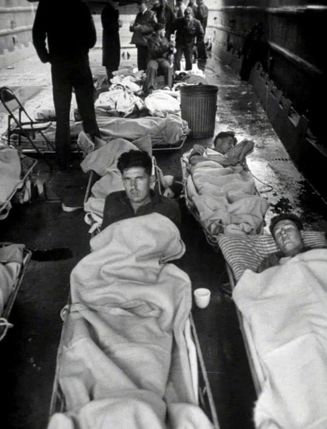 这是伦敦号重巡洋舰靠码头以后,抬下伤员的情景。舰上弹痕累累,清晰可见。 美国《生活》杂志记者罗伊·罗恩在码头见到“伦敦号”重巡洋舰归来的记录: “震惊的英美围观群众,看上去和那些受重伤被抬上岸的水手一样惊慌失措。上海那些国民党官员也同样感到十分震惊,他们意识到,共党做了一件所有中国军队此前从不敢做的事情——把西方列强的军舰从中国的内河轰了出去。”