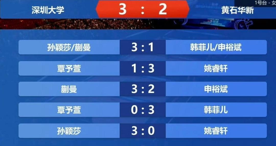 乒超联赛第三阶段8.30上午场战绩:孙颖莎蒯曼助力深圳大学3:2险胜黄石华新!