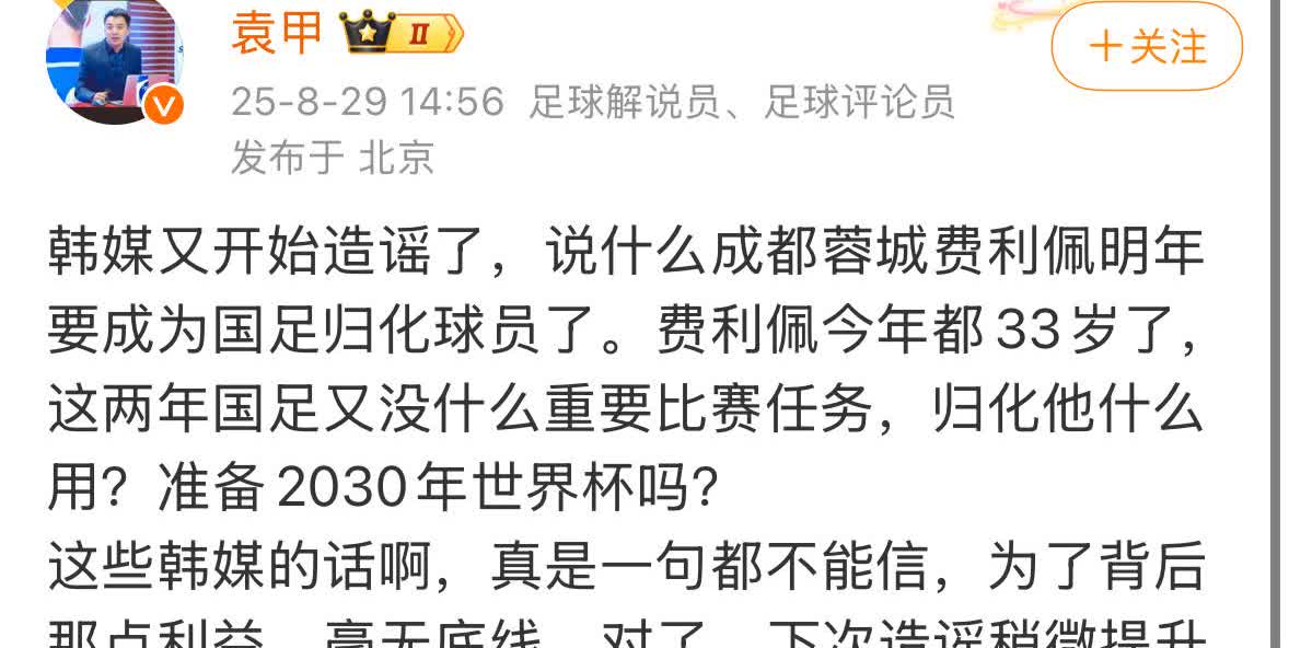 解说员袁甲今天表示,成都蓉城的费利佩完全没有规划的可能。这位巴西外援今年已经33岁了,到下届世界杯都要38岁了。 确实,相比之下,或许罗慕洛还有一点规划的可能。毕竟他今年才29岁,而且状态也开始回升了。罗慕洛这种类型的球员也是当前国足所急需的。