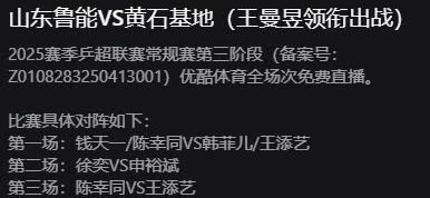 王曼昱缺席首场比赛,山东鲁能不会又要翻船吧。 我记得上次对战华南理工那场, 鳗鱼不在, 鲁能也输了。 那场大迪赢了陈幸同, 钱天一也输了。 这次我感觉鲁能也悬呢? 起码申裕斌对战徐奕和钱天一这两场, 很可能赢球。 如果女双再赢, 鲁能就输了。