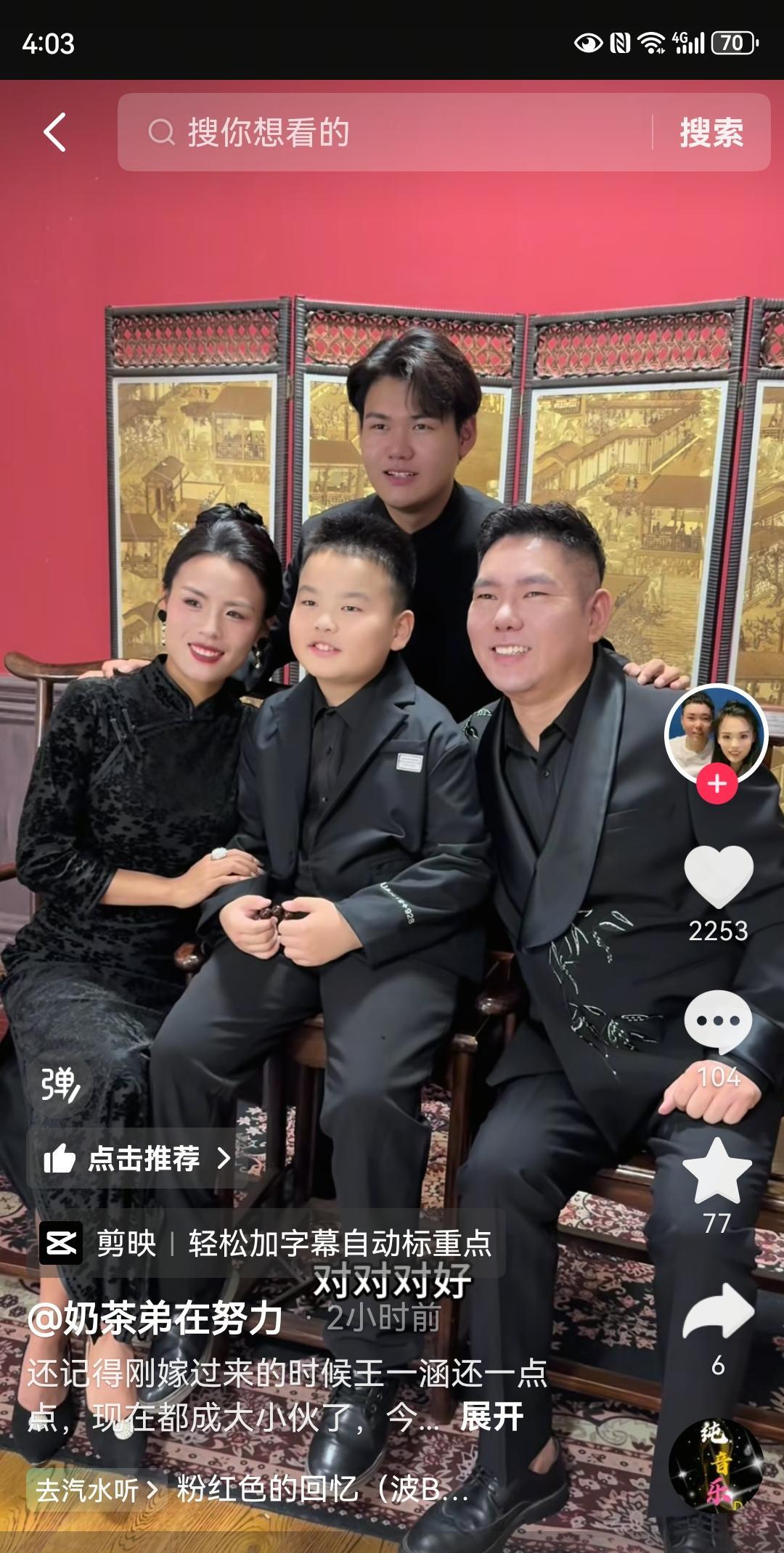 奶总家族的人都喜欢拍全家福。 之前是俩姐姐爱拍,家里肯定都有好几套的全家福照片。后面大双复婚后也拍过,今天又来一套全黑的照片,这这个意思?全黑的看过去怪怪的,寓意不太好吧?话说,他们的全家福不包括老人吗?可明明俩老人都在呀! 大双演了几年贤妻良母,特别是好后妈人设已经深入人心,都说相比于几个表兄表弟,王一涵是最幸福的。与其说是他最幸福,不如说是他情商高,心态好,不管家里人怎么对他,好的坏的他都接受。很是配合后妈的表演,对外表现出来的跟继母和谐,在爷爷奶奶,姑姑面前不多言多语。这种孩子跟谁的关系都会处得好,跟后妈是谁,人品好不好一点儿关系都没有。