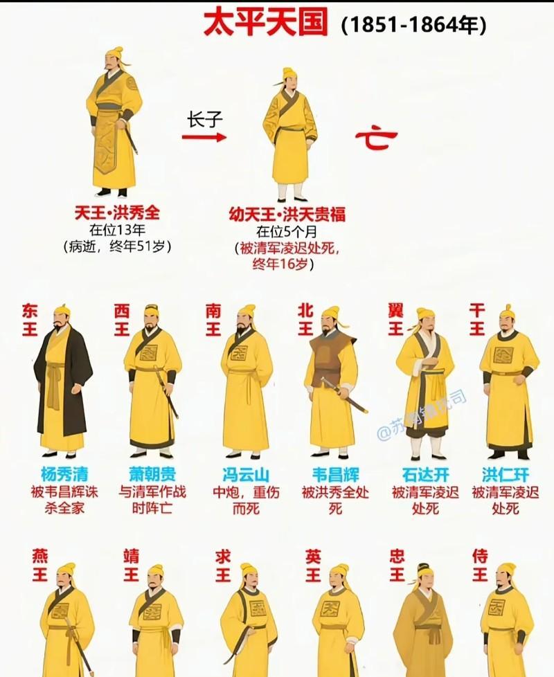 1851年,洪秀全率领拜上帝教教众在金田村发动金田起义,成立太平天国,自封天王。太平军攻占永安后,太平天国制定天国相关典章制度,最重要的是封五位首义王,分别是东王杨秀清,西王萧朝贵,南王冯云山,北王韦昌辉,翼王石达开,各王都归东王节制。 洪秀全出生于1814年广东花县一个农家,从小读书应试,却多次落榜。他接触基督教义后创立拜上帝会,传播教义时结识冯云山等人。杨秀清1823年生于广西桂平,烧炭为生,早年加入教众,通过假托天父附体获得影响力。萧朝贵1820年生于广西武宣,农民出身,加入后以天兄耶稣附体传教,擅长作战。冯云山约1815年生于广东,早年与洪秀全同窗,1844年去广西传教,发展大量信徒。韦昌辉1823年生于广西桂平,富家子弟,捐纳监生,提供资金支持起义。石达开1831年生于广西贵县,家境富裕,16岁加入,作战勇猛。这些人背景不同,却因教义聚在一起,推动起义。 拜上帝会信徒1850年底从各地聚集金田村,洪秀全宣讲教义。1851年1月11日,他宣布起义,成立太平天国,自称天王。起义军迅速行动,杨秀清指挥设防,冯云山组织后勤。清军来袭,三里圩交战中冯云山上阵砍杀清兵,太平军追击获胜。3月23日在武宣东乡,洪秀全正式登基,建立政教合一政权。太平军北上,9月25日攻占永安州城,清点物资修筑防御。在永安期间,太平天国制定官制军制礼制,推行自创历法。官员讨论制度,洪秀全听取,杨秀清记录。 12月分封五位首义王,洪秀全宣读诏书,杨秀清封东王管东方称九千岁,萧朝贵封西王管西方称八千岁,冯云山封南王管南方称七千岁,韦昌辉封北王管北方称六千岁,石达开封翼王。各王服从东王指挥,杨秀清统筹军务,萧朝贵巡逻,冯云山宣传,韦昌辉管粮草,石达开训练士兵。清军围城,太平军守御数月,杨秀清指挥放箭击敌,冯云山修补城垣。1852年4月5日突围,萧朝贵领队,队伍穿越山路继续北上。永安制度奠定太平天国框架,东王主导,五王协作扩展起义。 天京事变后,洪秀全启用年轻将领对抗湘军和清军,封李秀成为忠王,陈玉成为英王,李世贤为侍王,谭绍光为慕王。洪仁玕从香港到天京协助政务,封干王。石达开领兵出走,1863年在四川大渡河兵败,被清军俘获,在成都凌迟处死。陈玉成被清军俘虏杀害。太平天国军事节节失利,1864年天京被湘军攻占,洪秀全病逝。李秀成和幼天王洪天贵福、干王洪仁玕被清军俘虏凌迟处死。李世贤在江西被汪海洋杀害,谭绍光在苏州遭叛徒出卖杀害。 洪秀全领导起义,融合宗教和反清元素,吸引底层民众。杨秀清通过附体方式掌控军权,萧朝贵冲锋在前,冯云山基层组织,韦昌辉资金后勤,石达开军事才能,这些分工初期有效。永安封王后,太平天国扩张迅速,但北伐失败暴露战略问题。西征虽胜,却无法弥补损失。天京事变暴露领导层分裂,杨秀清野心膨胀,韦昌辉滥杀无度,洪秀全决策失误,导致实力大减。 后期年轻将领上位,李秀成忠王率军抵抗湘军,陈玉成英王作战,李世贤侍王在江西活动,谭绍光慕王守苏州,洪仁玕干王处理政务。这些人努力支撑,却因石达开出走和军事失利难挽大局。清军江北大营江南大营围困天京,湘军曾国藩指挥攻城。太平天国灭亡动摇清王朝统治,加速其衰落。 太平天国前期将领多为首义功臣,后期年轻一代接替,却无法逆转败局。运动从1851年金田到1864年天京,历经起伏。洪秀全病逝前,太平军顽强抵抗。清军俘虏处死多名领袖,灭绝余党。