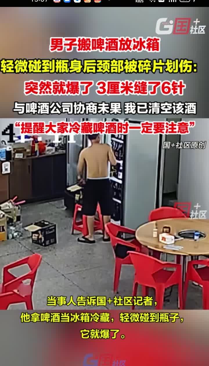 8月27日,汕尾市海丰县。男子搬啤酒放冰箱,轻微碰到啤酒瓶就爆了,自己颈部被啤酒