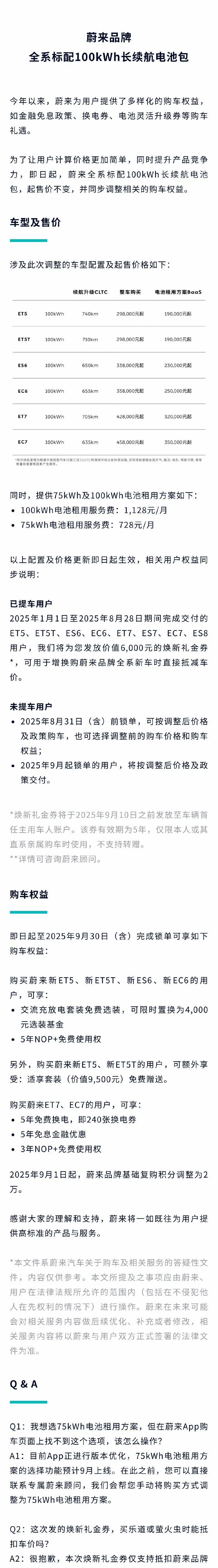 ES8上市的时候,也基本上确定了蔚来「全系下调」的必然性,配合之前100kWh电池的租电价格下调,这轮整体调价就好理解了。 虽然蔚来的调价并没有影响「指导价」,对于品牌的「表面伤害」不大;但是对于已经真金白银支持了蔚来的用户来说,6000块钱的「补偿方案」显然不足以平「民愤」。 但是「被刺用户」的杀伤力已经远比前几年小太多了,用户在一定程度上也都做好了思想准备。 那现在下手值不值? 以ET5/ET5T为例,包括小米SU7、极氪001在内的100kWh电版本,指导价都高于蔚来。我还是那个观点,如果Baas租电购买,吸引力还是要更大,毕竟现在的电动车,鲜有人能一口气开到5年以上。 那如果是ES6,购车需求里大概率就包含了「空间需求」,那就不如去隔壁看看乐道L90了,于情于理,它都已经成功的「以下犯上」了。 总而言之,蔚来,「活过今年」,已成定局!【来自懂车帝车友圈】