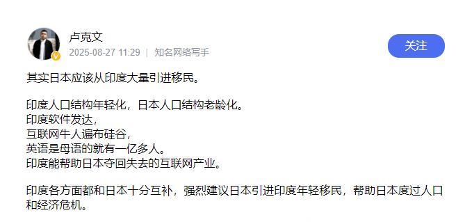 [太阳]著名大V卢克文:强烈建议日本引进印度年轻移民,帮助日本度过人口和经济危机,本以为会遭到全网群嘲,没想到网友们的评论却让人笑不活了! 日本老龄化问题是非常严重的,严重到什么程度,就这么说吧,前些年一位日本教授就这个问题作出回应,他竟然说老年人可以集体自杀,一起切腹,更令人没想到的是,竟然会有众多日本网友支持他的言论。 为此卢克文表示可以让日本引进印度年轻人来化解这场危机,主要是现在日本因为老龄化问题导致经济效益不太好,而刚巧印度这边软件比较厉害,两者可以柔和一下,让印度年轻人帮日本重拾互联网。 有网友认为,这简直就是锦上添花,太互补了,日本人太清净,印度人带来热闹,日本人喜欢捡垃圾,印度人带来充足货源,日本做饭团太干,印度配上糊糊。