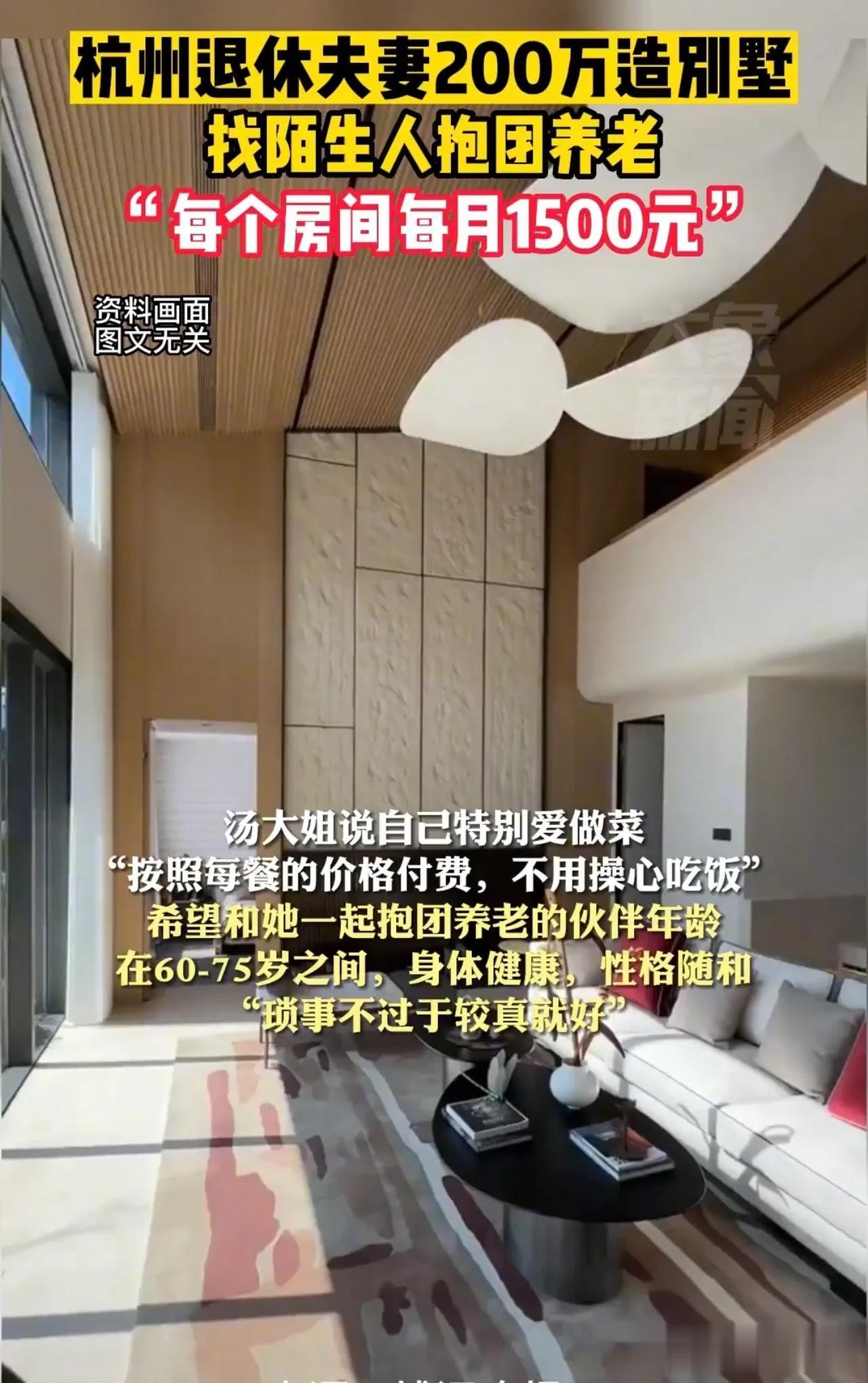 浙江杭州,有一对老夫妻觉得晚年生活非常的孤单,于是便花200万建别 墅,想要招募一些老伙伴们抱团养老。每个房间每个月收租1500元,水电费每月均摊,饭菜按照每餐的价 格付费。网友:这样的抱团养老,矛盾会接踵而来!