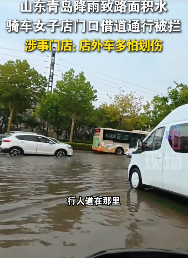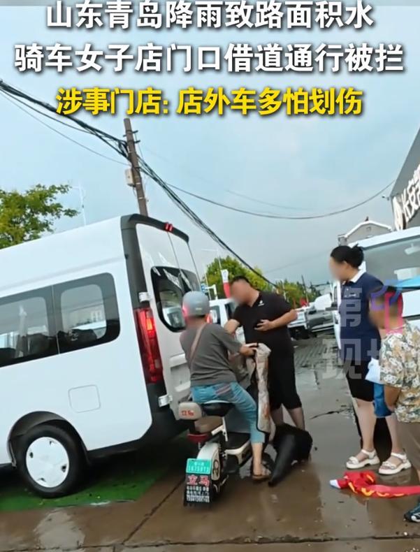 青岛又躺枪了!山东青岛,由于持续降雨,路边积水严重,一位骑电动车的女子试图从一家4S店门口借道绕行。没想到,店里的工作人员迅速拉起了警戒线,坚决不让她通过,女子解释,主路积水太深,电动车根本过不去,只是想临时从店门前绕一下,不会影响他们。但几名员工态度强硬,坚持不让 现场视频显示,女子挪开了店方设置的围栏,一名男员工突然冲上前,一脚踢飞围栏,然后直接站在电动车前,用身体挡住去路。他不断指向旁边的人行道,要求女子从那边走 女子无奈回应:人行道也都是水,怎么走?双方争执不下,最终女子还是硬闯了过去 事后,4S店方面回应说,不让过是因为店门口停了很多待售的新车,万一被刮到或碰到,责任说不清楚。他们自称是好言相劝,但对方不听 听起来似乎双方都有理由,但许多网友看完视频后却纷纷站队女子 大家不理解:明明下雨天积水是事实,临时借个道,能有多大风险?店家是不是太不近人情? 我觉得,如果那是公共道路,店家无权阻拦;如果真是商家自有范围,骑车人只能绕行。归属权说清楚了,矛盾自然少很多。雨水没法选择往哪流,但人行道和通车道,是完全可以商量想办法的 #路面积水 女子店门口借道通行被拦#