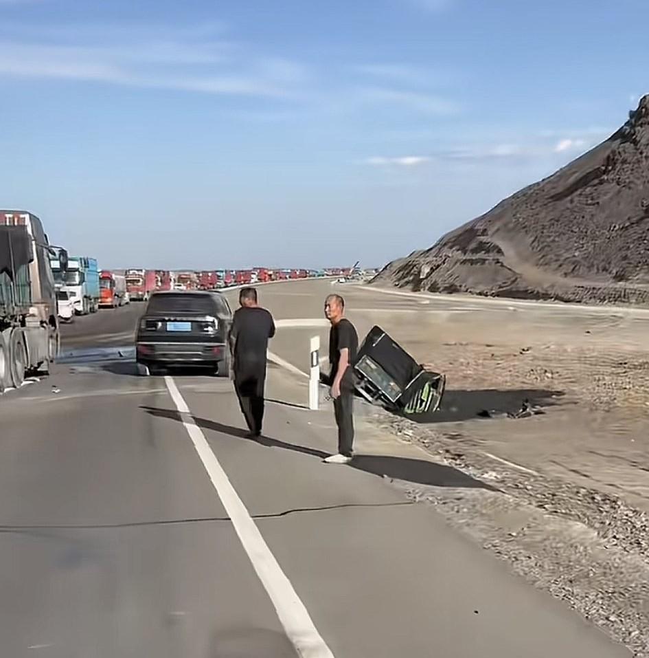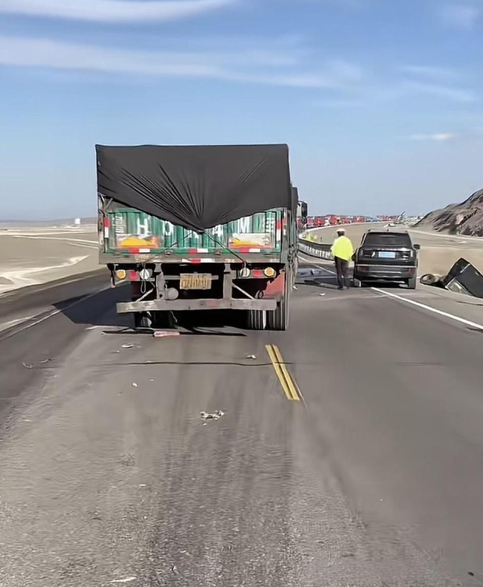 8月28日,新疆,一辆SUV跨车道左拐,导致3辆半挂车发生事故。 从后车发出的监