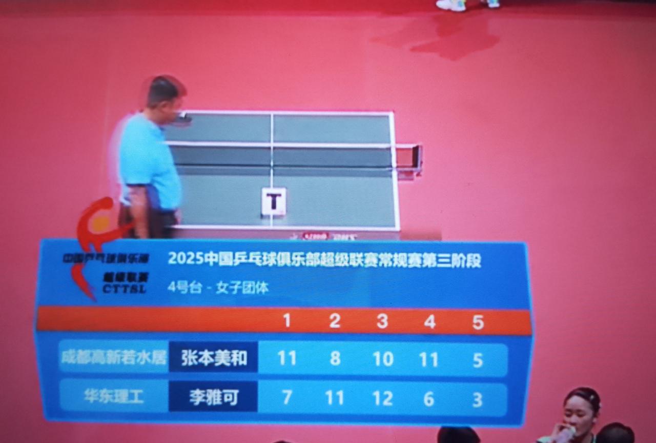 张本美和终于赢球了,在输了两盘女双和一盘女单后,今天终于出力,赢下李雅可。 #万能生活指南# 成都若水居队对阵华东理工大学队,双打先输一盘,女单向俊霖被王艺迪零封,第三盘,张本美和再次上场,对阵李雅可,前三局,李雅可2:1领先, 第四局:5平后,张本美和连续得分,11:6拿下,扳平大比分。 决胜局:张本美和5:3,换边,李雅可叫了暂停,暂停回来,张本美和发球后进攻连续出界,5平,张本美和变线得分,大喊一声,反手多板相持得分,7:5,发正手短球得分,快撕得分,9:5,接发球底线长得分,接发球反手底线长得分,11:5拿下。 张本美和终于赢了一场,有进步,这场真的出力了!