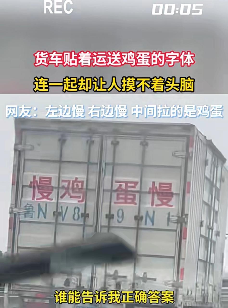 车尾贴的这几个字,本来是提示后面司机的,到底啥意思啊?让人不能秒懂。意思是后面车慢慢的开,我车拉的是鸡蛋,另一个意思是。提示别人别急着超速,也别催开快车,拉着鸡蛋得慢慢开。如果是这意思司机可贴错标签了,应该把两个慢贴一起。慢慢,鸡蛋,能好理解些吧!这几个大红字贴的,后车司机都踩不动油门了。分散注意力了,这也太危险了。也有可能司机是提示车两边的车#车尾字# 。左也慢点开右也慢点开,车上拉是鸡蛋。#车尾标志贴# 你们说到底咋读吧?#车尾牌# 绝对不能读成慢鸡,慢蛋。