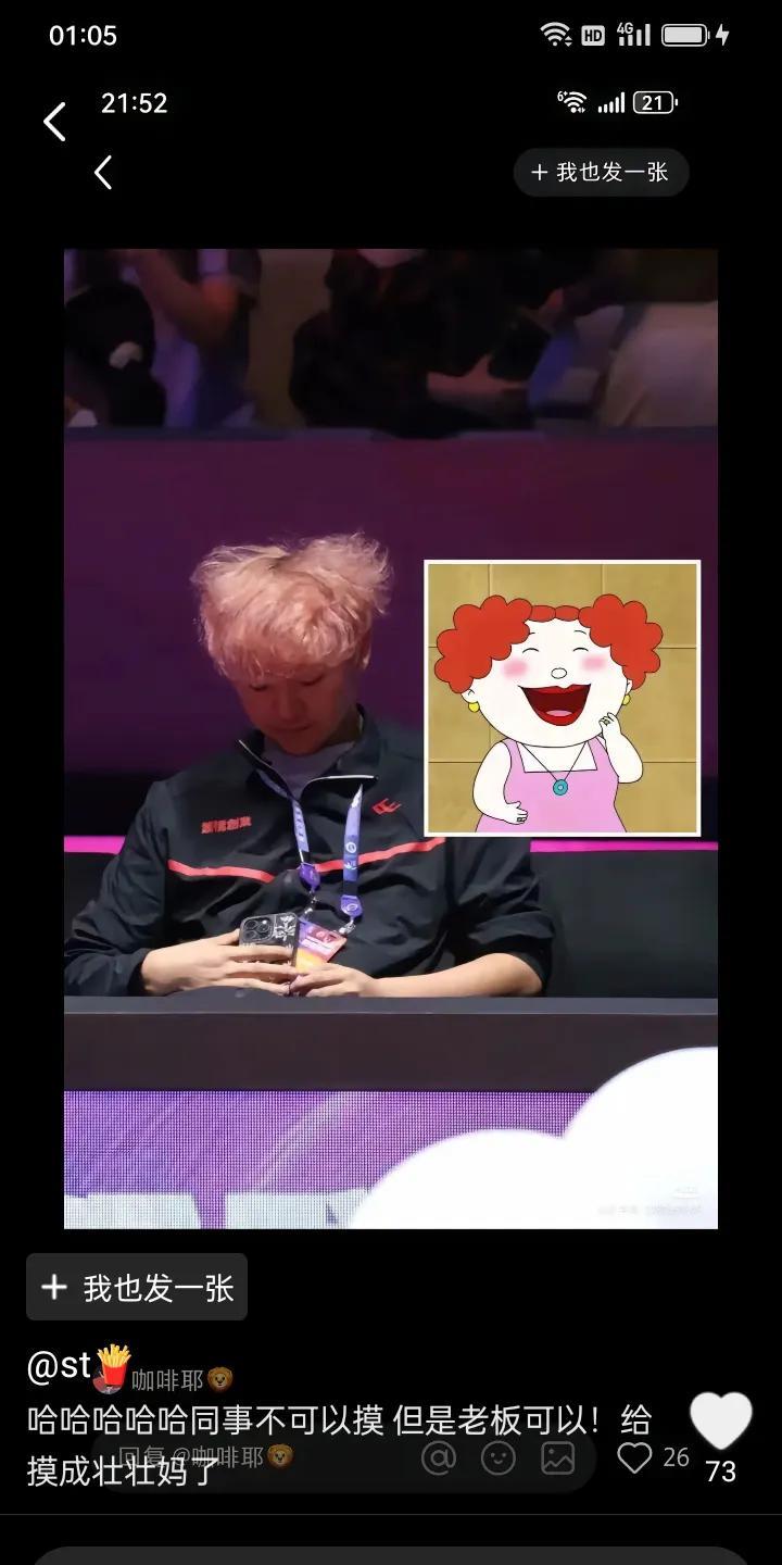 王cc的发型被大头和草莓熊摸的炸毛了[捂脸][大笑]!王cc你说大家都同类黑头发,你非要另类的搞个粉色个性。王楚钦和草莓熊看你能顺眼吗?草莓熊摸摸王cc头发,王cc挡着不让他摸。大头一看,呀小子背着我们整的这么时髦。还不让摸?于是两个人一起一阵呼啦王cc头发。他们两个人走了留王cc凌乱的头发在空中。[呲牙][捂脸]他们之间就像小孩子一样好玩。