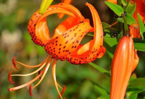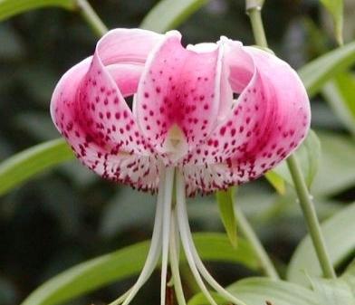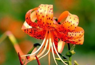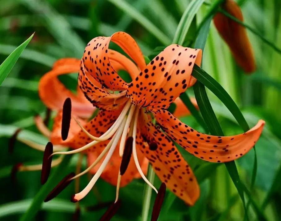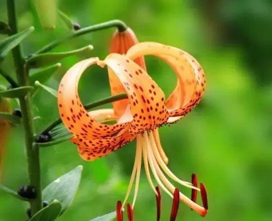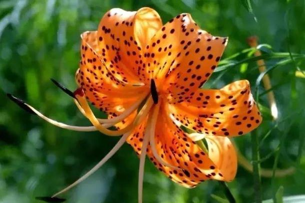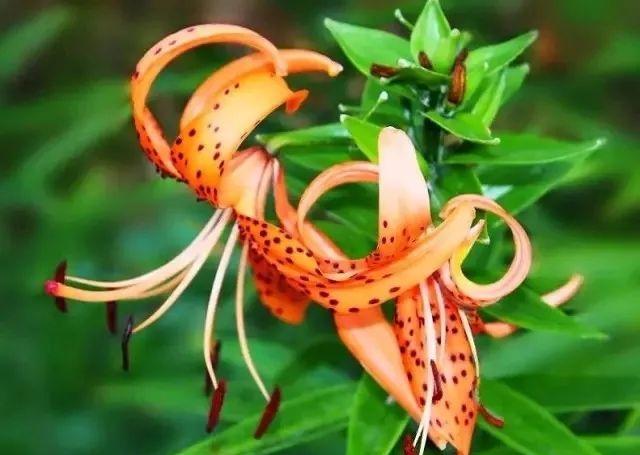 卷丹百合花的浪漫 暑假期间,送孙子去钢琴老师家学钢琴,老师家阳台上的卷丹百合花开的热情奔放,姿态优雅迷人。 卷丹百合原产我国、日本、朝鲜等地。植株可高达1.5米,被称“百合之冠”。主要分布在川西高原。 卷丹百合色彩独特,花色多橙红或粉紅,花瓣反卷,故有“卷丹”之美名,因花瓣上的紫黑色斑纹具有神秘气质,像虎背之花纹,故又有“虎皮百合”之雅称。其别称“番山丹”,云南滇南则称之为“倒垂莲”。 卷丹百合造型很可爱,6枚花瓣反卷,花头朝下,像一盏盏小灯笼,六个雄蕊向外长长地伸出,褐色花药像灯笼的烛芯一样,张扬的野性之美优雅迷人。 卷丹百合不仅花开艳丽,还是药食两用植物,它的鳞茎是主要食用和药用部位,不仅肉质肥厚口味清甜,还富含淀粉、蛋白质、维生素和矿物质等营养成分。可用作凉拌、煲汤、煮粥等食用。 现代权威中药典籍《中华本草》将卷丹百合收录为基源植物,明确其药用部位为鳞茎,性味甘、微苦,微寒,归心、肺经,具有养阴润肺、清心安神的功效,主治阴虚久咳、虚烦惊悸、失眠多梦等病症。 #晒图笔记大赛#