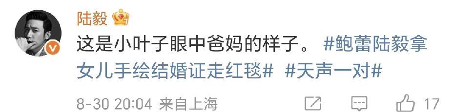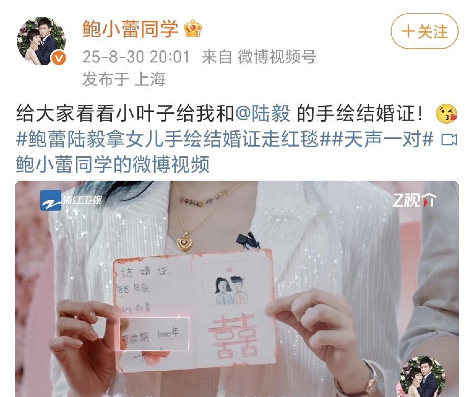 鲍蕾陆毅晒女儿为自己手绘的结婚证! 8月30日,鲍蕾在社交平台晒出了参加综艺节目《天声一对》走红毯的视频画面。在红毯上,她和老公陆毅手拿女儿小叶子为他们手绘的结婚证,好幸福。连照片头像都有 ,真的是很棒。 这结婚证画的有模有样,真的很厉害。陆毅在老婆鲍蕾的评论区留言:“这是小叶子眼中爸妈的样子。 ” 这一家子真的好幸福,结婚了这么多年,谈恋爱也好多年,真的是很长久了。小叶子长大了也是很棒的孩子。