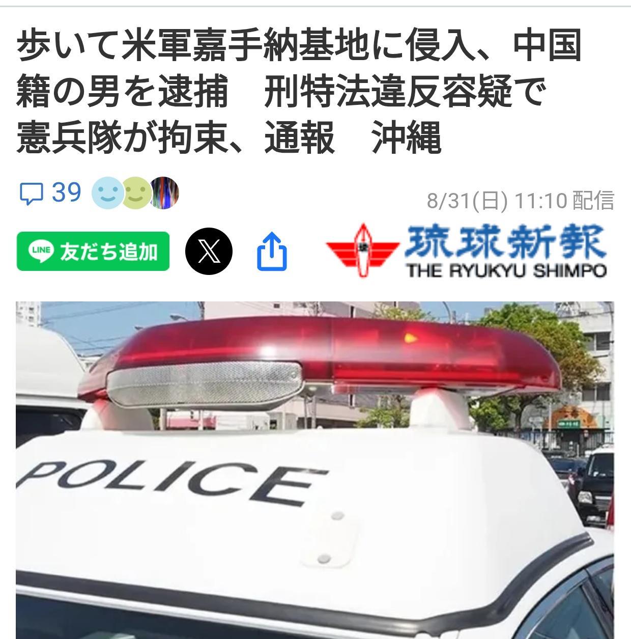 中国籍男子进入冲绳嘉手纳美军基地 据日媒《每日新闻》、《琉球新报》8月31日报道,冲绳县警察署以涉嫌违反《日美驻军地位协定》相关特别刑法为由,逮捕了一名中国籍男子戴龙(“ダイロン”音译)(37岁)。 根据逮捕令所述,8月30日上午11时30分左右,戴龙“无正当理由”步行进入了嘉手纳基地第二道大门,被美国空军宪兵队发现后报警。 戴龙于当天下午 2 点后被移交当地警方。 戴龙持有中国护照。 警方正在调查其目的。