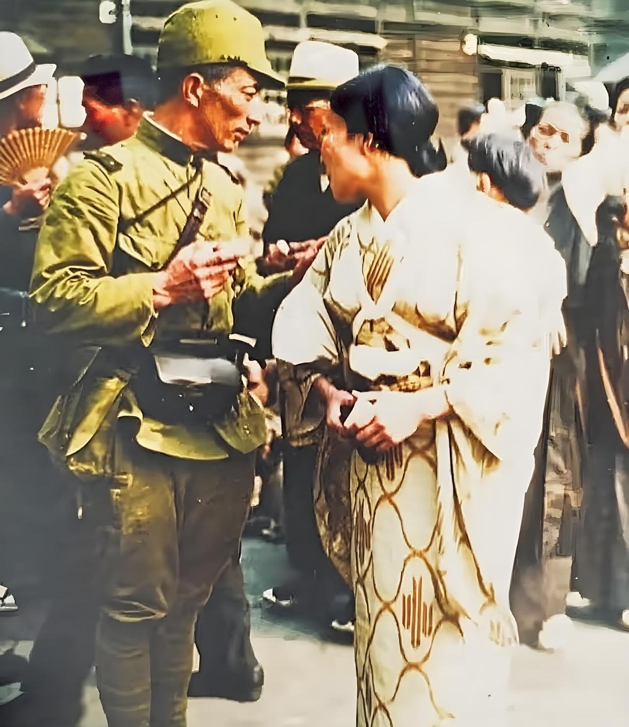 这是一名派往中国战场的日本士兵,临上船前向妻子孩子道别。 1943年,渡边三郎加