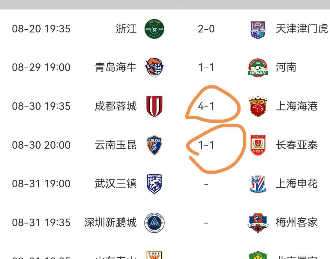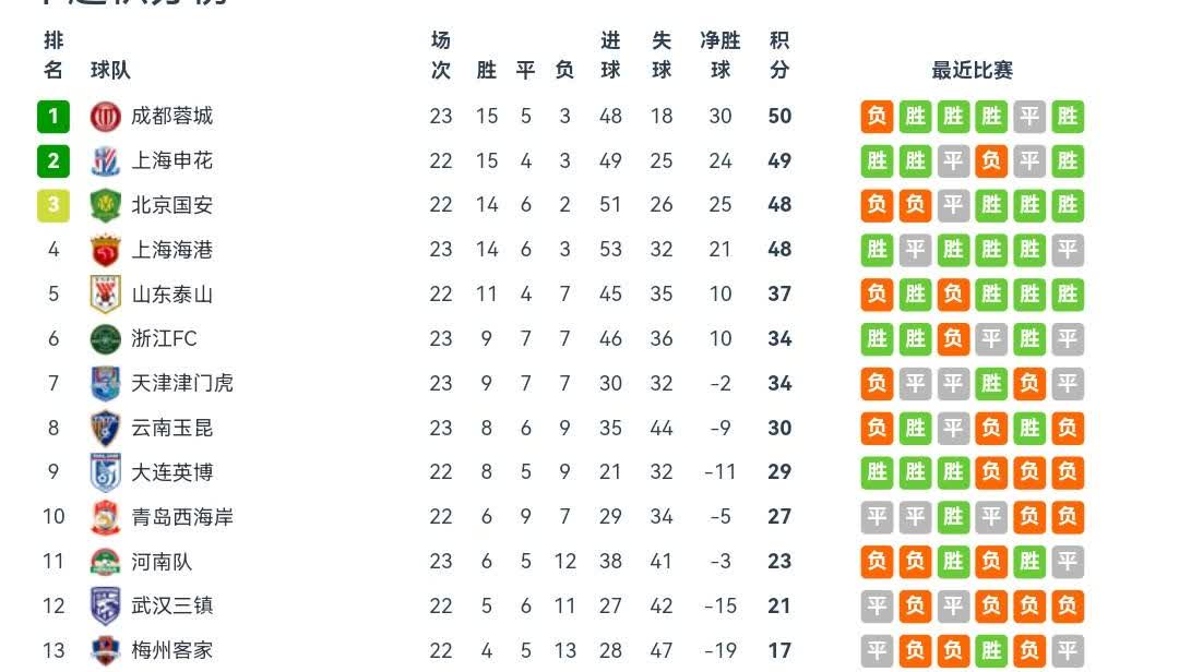 中超积分榜:成都蓉城50分第一,上海海港48分第四,长春亚泰16分垫底! 截止8月30日晚,中超第23轮进行完4场较量,包括成都蓉城4:1大胜上海海港,云南玉昆1:1长春亚泰!成都蓉城与上海海港的榜首大战呈现一边倒的形式,蓉城强大的攻击力与良好的防守让海港非常困难,成都蓉城面对上海海港已经豪取3连胜,凭借本场比赛的大胜,成都蓉城暂时登顶积分榜,上海海港的卫冕之路越发困难! 处在倒数第一的长春亚泰,本轮客场1:1战平云南玉昆,拿到宝贵的1分,与处在13、14位的梅州客家、深圳新鹏城只有1分差距,保级希望还是很大!