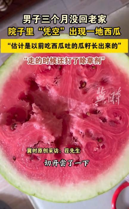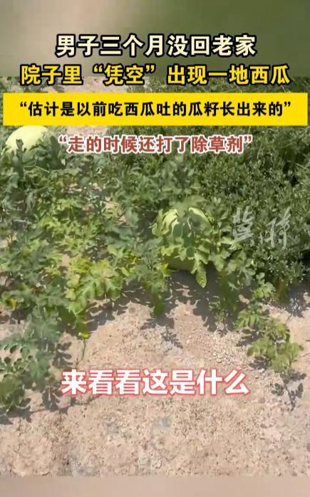 “离了个大谱!”8月6日,江苏徐州,一男子离开老家3个月,临走之前在院子里洒了除草剂,谁知再次回家时,却发现院子里长满了西瓜!其中最大的足足有15斤重,切开之后尝了还非常甜,网友:这是小孩子在院子里“施肥”了吧! 男子因工作原因离开老家,预计需要远行整整三个月。离家前,他看着院子里疯长的野草,心头泛起一丝忧虑。他想着,三个月后回来,这些草肯定更难清理,到时候连下脚的地方都没有。 为了图个省事,他特地去了农资店购买除草剂。接着,男子将药剂洒遍了院子的每个角落,用量非常大。觉得野草难题已经解决,他才安下心来,锁好院门远行而去。 三个月后,男子如期回家。他满心期待,推开院门能看到一个清爽干净的院子,一根杂草都看不见,谁知,当他打开院门的一刹那,整个人瞬间愣住,呆若木鸡。院子里并非空无一物,而是铺满了密密麻麻的西瓜。 昔日野草丛生的地方,如今仿佛变成了一片专门开辟的西瓜地。野草确实消失了,但眼前的景象让他完全无法理解。 男子看着满院的瓜果,困惑地自言自语:“我啥时候种过西瓜啊?”他完全搞不明白,这景象实在超出了他的所有预料,他回想起,这些西瓜可能源于去年夏天随意吐在地上的瓜籽。当时只是为了图个省事,随手一吐,根本没放在心上。 谁知,那些瓜籽竟在院子角落的缝隙里悄然发芽,瓜藤一路蔓延,爬满了整个地面,甚至有的还爬上了台阶。院子里结满了大量的西瓜,有些西瓜个头惊人,掂量起来,每个的重量大约能达到十五斤。更让人称奇的是,这些西瓜从未有人管理,没有人给它们浇水施肥。 男子明明洒过除草剂,按照常理,植物本应枯萎死去。然而,这些西瓜不仅毫发无损,反而一个比一个长得壮实,这让他感到更加不可思议。 相比之下,许多人特意在菜地里种西瓜和水果,每天辛辛苦苦浇水施肥,却往往收获不理想。而这些无人照料的“野生”西瓜却如此繁茂,令人惊叹。 他摘了一个看起来已经成熟的西瓜,切开。瓜瓤红得发亮,瓜籽乌黑发亮,阵阵清甜的香味立刻扑鼻而来,尝了一口,西瓜味道特别甜,品质丝毫不比外面卖的差。尽管瓜皮稍厚,但这意外的收获,依然让他惊喜万分。 考虑到一个西瓜的市场价格至少20元左右,这片“免费”的瓜田,无疑给他带来了一笔巨大的“意外之喜”,很快,这件奇事就在邻居们之间传开了。大家闻讯纷纷跑来围观,对院子里的景象啧啧称奇,打趣说院子是不是有“灵气”。 邻居们笑着询问男子,当初买的究竟是除草剂,还是某种神奇的“催瓜剂”。男子将这一幕拍成视频,发到了网上,视频一经发布,立刻引发了网友的广泛关注,一下子就火了。网友们看得乐不可支,纷纷调侃这简直是现实版的“种豆得瓜”。 有些网友还半开玩笑地猜测,是不是家里“熊孩子”无意中的“施肥”太到位了,才让西瓜长得如此茂盛,不少网友也关心起一个实际问题:“洒过除草剂的土地,长出来的西瓜还能不能安全食用?” 许多网友表达了对这种“无人管理却丰收”现象的羡慕,毕竟他们精心打理的菜园,投入大量精力也未必有如此好的收成。 对此,你怎么看?