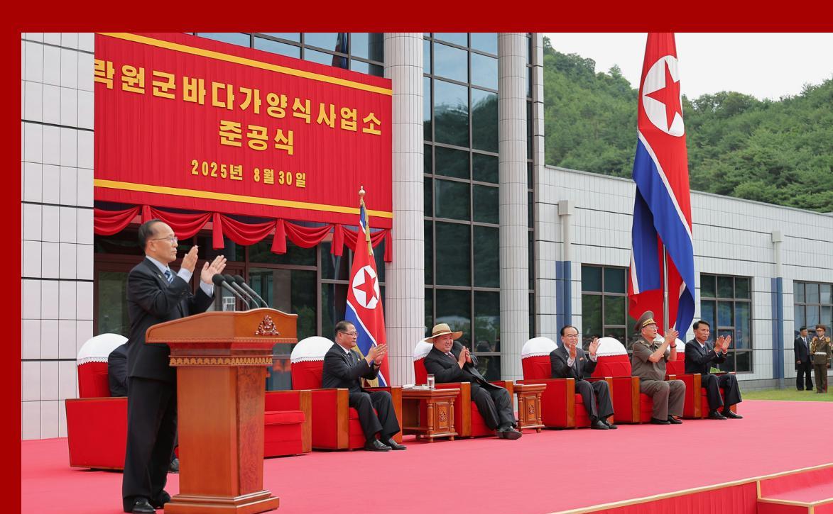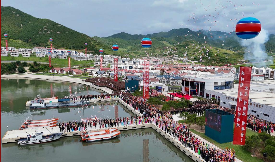 金正恩元帅出席乐园郡浅海养殖事业所和渔村新式住宅区建设工程竣工典礼。 时间是8月