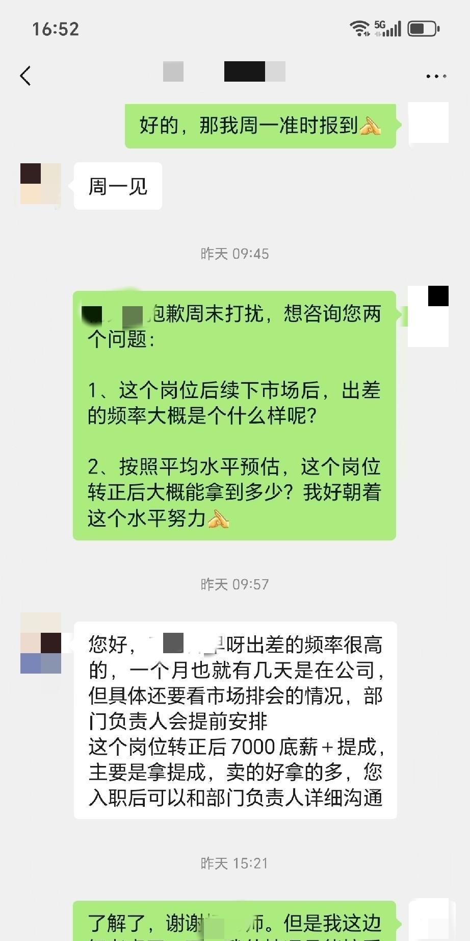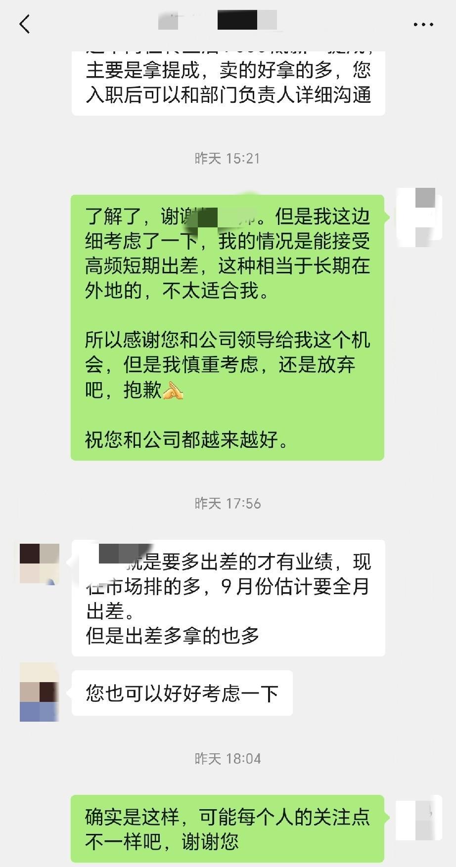 人到中年失业在家,没班儿上甚至连面试的时候对自己说“只要有地儿要我,我就去”,历经8个月好不容易面试通过一个,却还是“有所求”的给拒了... 队友上周五上午面试,还在回家的公交上,就得到应聘公司面试通过的电话,试用期6000,转正后7000+提成,社保公积金按照实数缴纳,缴纳节点是每个月15号。只不过出差的频率会比较多,不过话说回来,出差多才能多拿提成不是... 尽管没失业前,拿的是20000+的工资,但是好汉不提当年勇,这几个月的失业,早已磨平心态,我俩都认清了不可能回到曾经的现实,所以说实话当时接到面试通过的电话,真的是挺激动的... 但是回到家冷静下来一考虑,这种长期飘在外面的工作好像对自己并不是很适合:孩子刚上小学,无论是生活还是学习,能给他更多的陪伴显然会更好;父母70+的年龄,虽然现在身体都硬朗朗的,但是毕竟年龄摆在这,万一哪天有点啥事... 说白了,就是普通人在挣钱和顾家之间,要选择哪个[捂脸]最后一商量,还是拒了吧[流泪]倒不是因为工资降的太多,而是毕竟没到那么缺钱的地步,能多陪伴孩子成长还是多陪伴吧[加油] 也希望每个如我们一样,在挣钱和顾家上左右为难时,能够守住自己的初心,做出一个最适合自己的决定,然后坚定不后悔的走下去,就够了[谢谢]