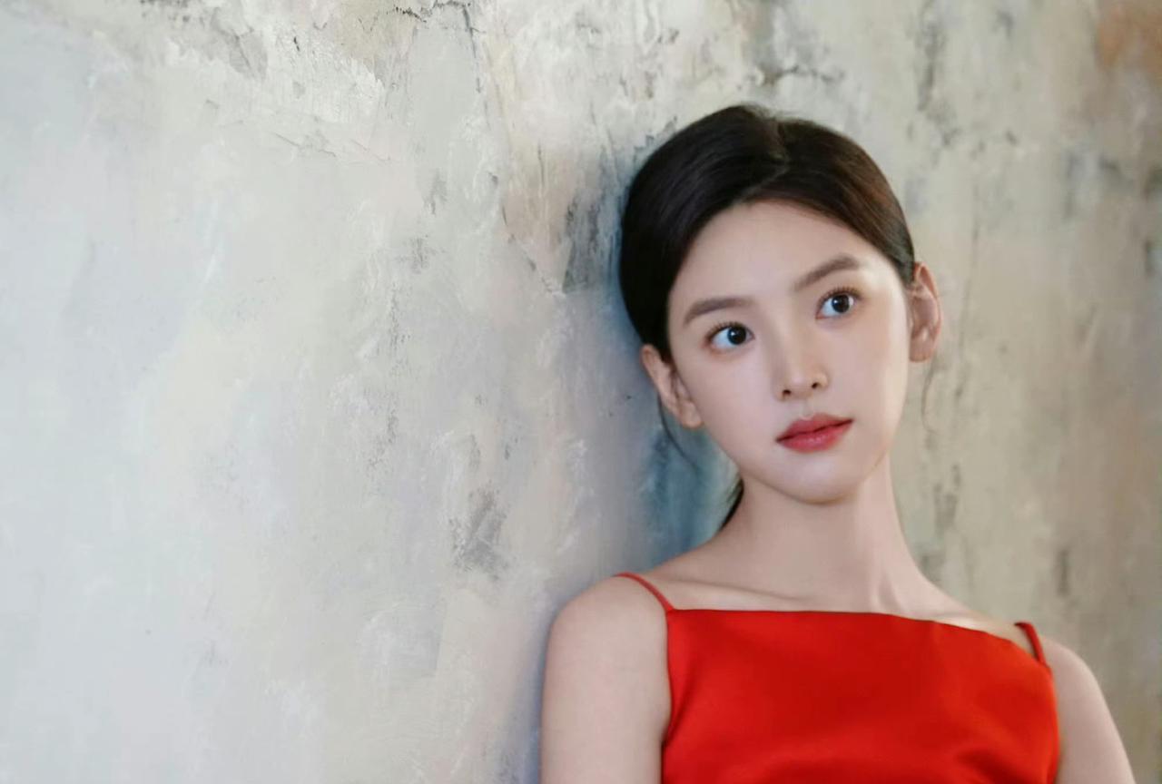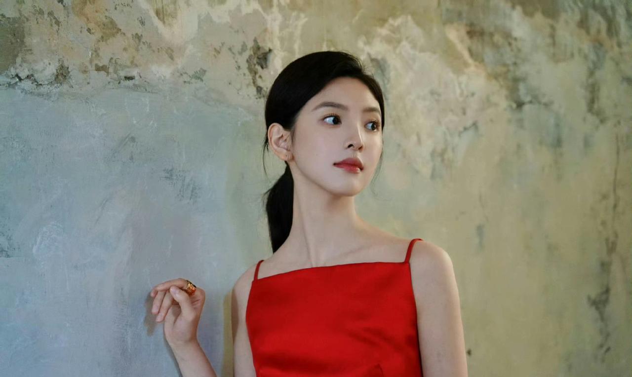 #章若楠#红缎吊带裙似火焰凝成,衬得肌肤愈显莹润,马尾轻垂,在简约空间里,每一个