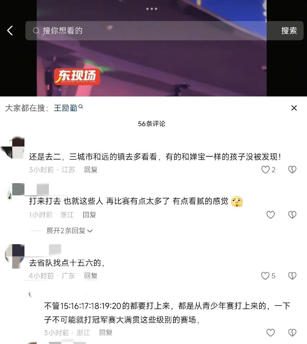 08月31日,王励勤出现在乒超赛场上,是感受到了男队阶梯的不足,所以带着男队教练王皓,刘恒,刘起强,是来挑选人才吗?看着王励勤认真又严肃,心事重重的样子,可能还没发现好苗子,看来男队未来的路真的难上加难了 有粉丝建议要去二,三线或是镇上看看,或许能挖掘出像全红婵和孙颖莎,王曼昱这样的好苗子,感觉好像也有点道理,毕竟现在的乒超联赛,感觉不像我们以前看的那种比赛了,三天两头就打完了整个赛季的比赛,大部分都在打商业赛,这样怎么能发现好苗子呢?其实国内喜欢打乒乓球的人还是蛮多的,但还是要遇到伯乐和靠运气 看来王励勤还是要带着队伍多去民间走走,早日出现第二个樊振东的好苗子出来,乒超赛还是国乒主力的天下,打来打去都是那几个人,未来之星在哪呢?这或许是王励勤如今要想的问题