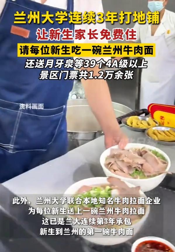 兰州大学火了!一家长来送孩子开学报到,因为是从外地赶来,担心学校周边没地方住,可到了学校,才发现学校竟然为家长提供住宿,虽然是打地铺,但胜在免费,而且还免费请新生吃兰州拉面,这让不少家长都感觉很暖心 据悉,这并不是兰州大学第一次这样做,根据附近酒店老板介绍,兰州大学已经连续三年为学生家长提供免费住宿,学校会在校内场馆打地铺免费提供床位,为新生家长设置了临时住宿区 这还没完,每一名报到的新生,还能获得一碗免费的牛肉拉面,同时,学校还给2025级新生每人发了一张旅游门票。包括敦煌月牙泉、张掖七彩丹霞等39个4A级以上景区,一共送出一万两千多张。这意味着,未来四年,他们有很多机会去走走看看,真正感受这片土地的魅力 很多网友感慨,这才是真正站在学生和家长角度考虑问题 说实话,兰州大学地处西北,资源未必有东部高校多,能做出这样的暖心举措,靠的不是预算,是诚意 这样的安排看似细节,却能看出学校的思路。家长放心了,学生自然能更快融入校园;学生手里拿到景区门票,不仅能出去看看风景,也更容易在朋友圈里传递出一种认同感 一个地方的高校,往往也是一座城市最重要的窗口,兰大这套组合拳,不仅让新生和家长心里暖乎乎的,也等于为兰州乃至甘肃做了一次很自然的城市宣传 #兰大连续3年打地铺让新生家长免费住#
