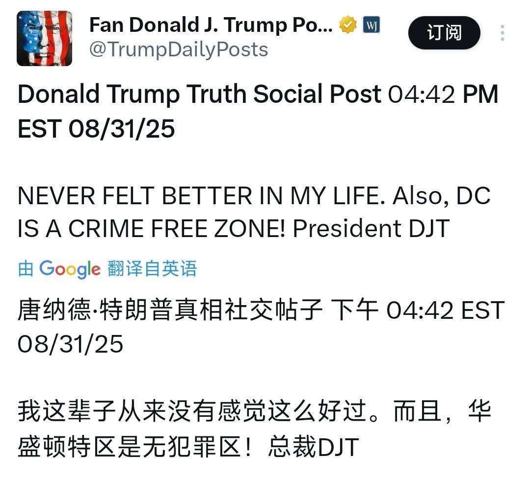 突发新闻:特朗普发布关于华盛顿特区犯罪和健康状况的帖子。 特朗普今天(北京时间9月1日)写道:“我这辈子从来没有感觉这么好过。而且,华盛顿特区是无犯罪区!” [机智]评几句:近日,特朗普健康状况传言四起,甚至荒谬到传其去世。他深知外界质疑,又恰逢周末未公开露面,便抛出此帖回应。“无犯罪区”和“感觉好”的自证,是否能彻底打消外界的质疑,好待观察。