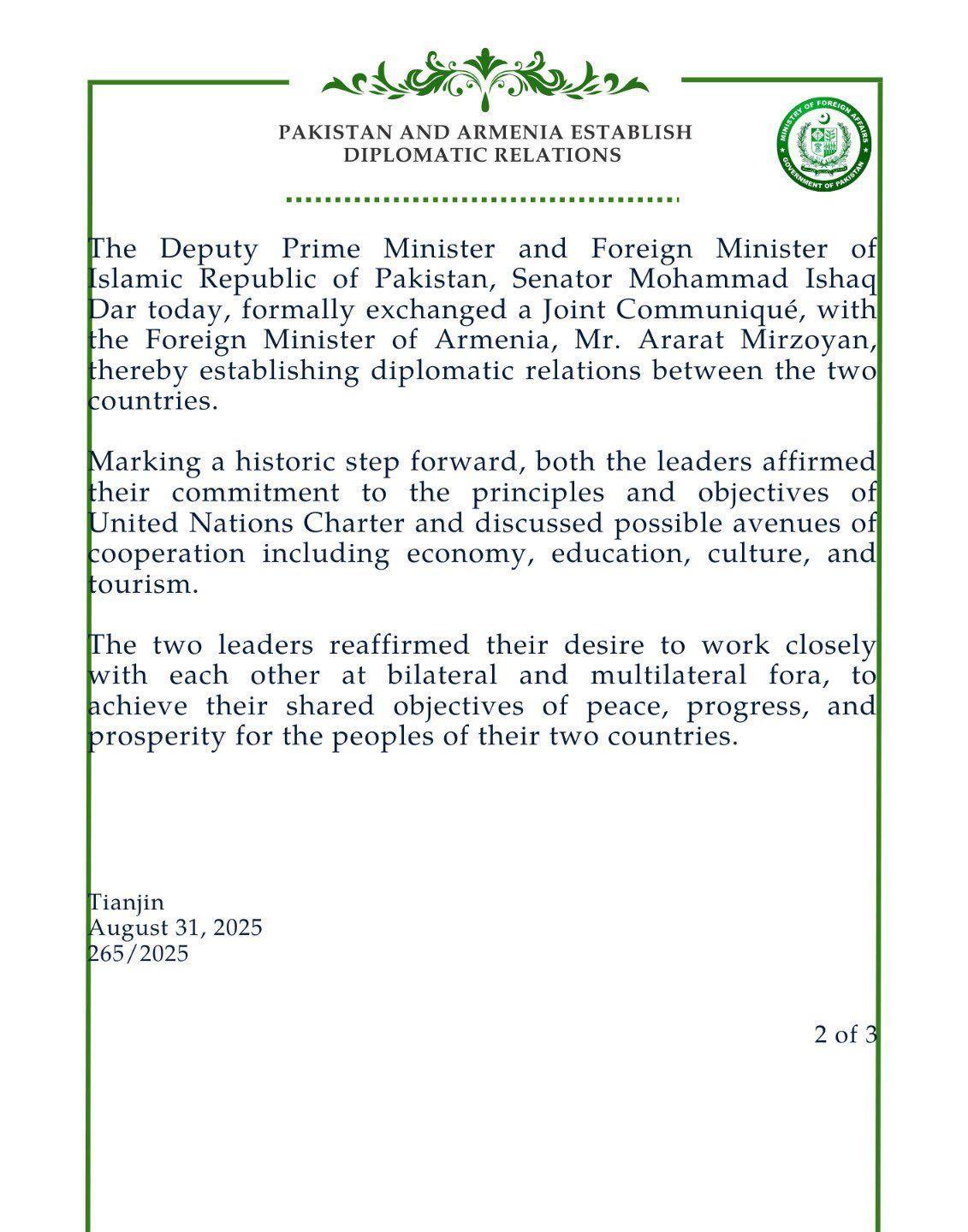 上合峰会刚开幕就办成一件大事,巴基斯坦签署文件,正式与亚美尼亚建交 8月31日,上合峰会甫一开幕,便有一项令全球瞩目的成果诞生:巴基斯坦与亚美尼亚两国外长于天津正式互换联合公报,宣告两国建立外交关系,为地区外交格局添上新彩。 这是一次历史性的建交,也极具突破性意义。 从地缘政治角度来说,这是一次重大转变。几十年来,巴基斯坦一直与阿塞拜疆关系密切,但始终不承认亚美尼亚是主权国家。这也让巴基斯坦成为了唯一一个不承认亚美尼亚的联合国会员国。而此次建交,意味着巴基斯坦改变了立场,未来,亚美尼亚-阿塞拜疆-巴基斯坦三角关系将被重塑,巴亚两国的误判风险会减小,两国也会就此开启新的合作,并强化在多边框架下的协调。 而从中国的角度来说,这也是中国在成功调解伊朗与沙特的敌对关系后的又一重大外交突破,突显了中国以及上合组织这个平台,在维护全球和地区和平中的极重要的价值,也标志着中国在全球外交中,正成为日益重要的调解者。