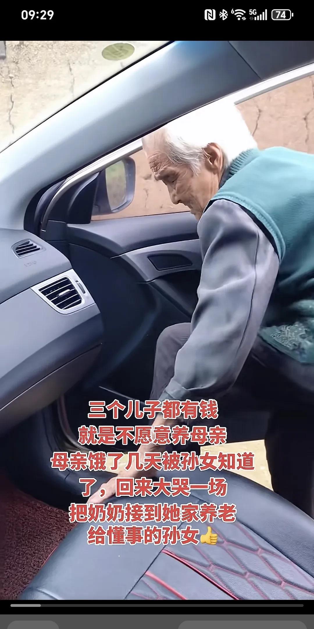 三个儿子都有钱,就是不愿意养母亲,母亲饿了几天被孙女知道了,回来大哭一场,把奶奶接到她家养老她,给懂事的孙女点赞! 好姑娘,为你的孝德点赞,希望你能好好开导和劝慰你母亲一下,要知道,人终将都要有老去的一天! 天理难容,不会有好结果的,美女心地善良,好人有好报,一生平安幸福,健康快乐!