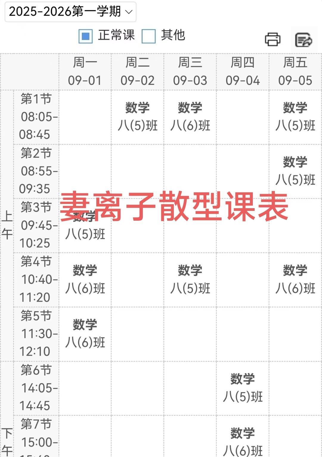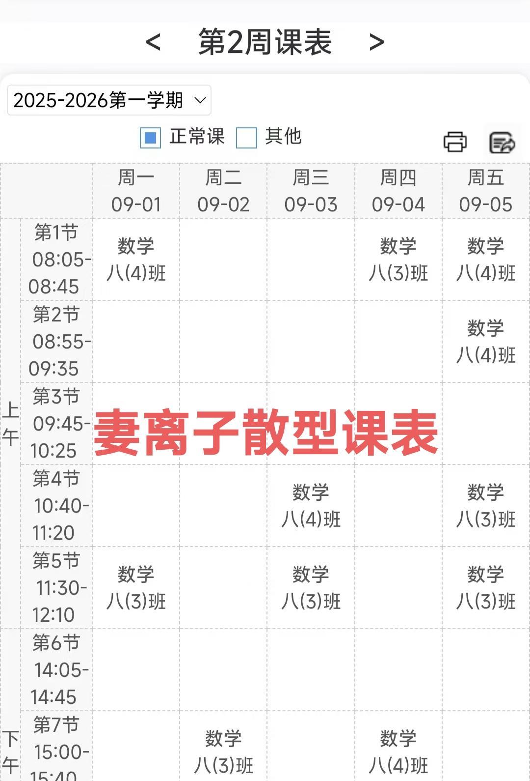 “妻离子散”型课表,教了这么多年书,这样奇葩的课表的确很少见。这据说是外包给公司排的课表,这是第二次生成的课表,行内人士来看一看,这样的课表,真的会严重影响教学进度和质量。一个老师教两个班,一节课排在天上,一节课排在地下,这倒没什么。关键是有些老师教两个班,同一天有一个班有两节课,有一个班一节课都没有,教书的都知道,这样排课真的很荒唐。 当然,这不是学校教务处自己排的,是公司排的,我估计是输入的指令不清晰,输入的指令不具体不详细,才会生成这样人人喊打的课表。其实说实话,就排课表这件事情,把上学期的课表适当调整,很快就完成,不一定非得搞什么人工智能,过度依赖人工智能,反而是简单的问题复杂化,花了大把的钱,效果还不好。人工智能终究还不能完全代替人的智能,它只是保证每个人的科不重复,很多具体的需求,还不能满足。#教育##头号创作者激励计划#