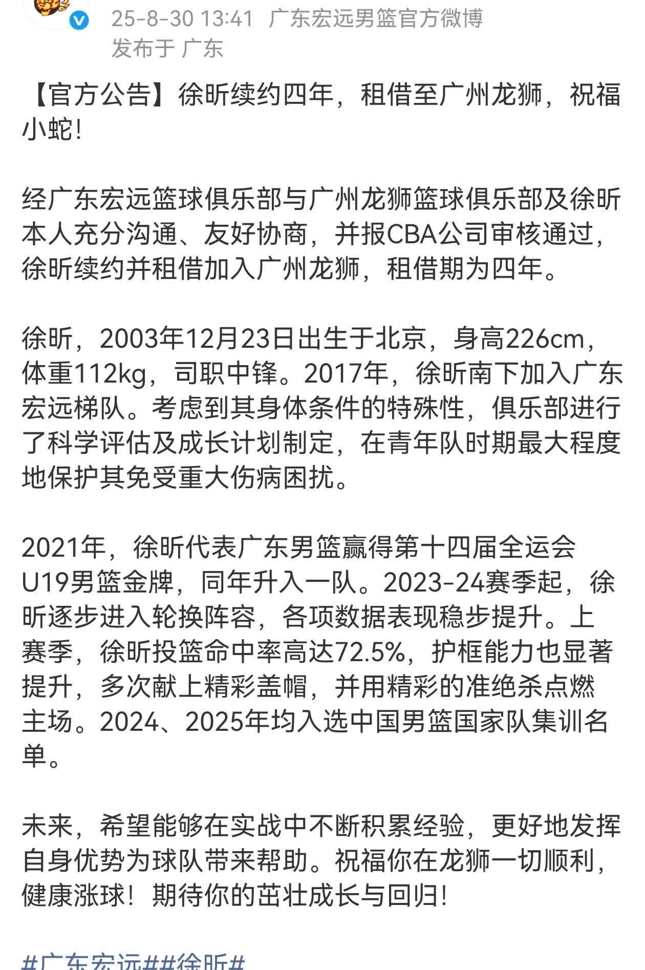 徐昕怨气未消,换俱乐部只寥寥几句话。宏远官宣却详细解释对徐昕的培养细节,根据他的条件,制定成长计划,并不是刻意打压。 很多球迷都说,以徐昕的身高和体重,没受大伤就是最大的收获。 从徐昕闹转会可知,徐昕太想要出场时间了。也是这几年压抑的宣泄。 那次硬刚杜指导,是不理智,也是一种反抗。他想既然发生了,无可挽回,只能提交转会申请。 这次徐昕是一租借形式转到龙狮,四年内,宏远可以付出一定的金额属回,这样的话,就看徐昕这几年的表现,如果大伤或表现出糟糕数据,那宏远肯定会抛弃,如果打出姚明的水准,宏远可能会要回来。