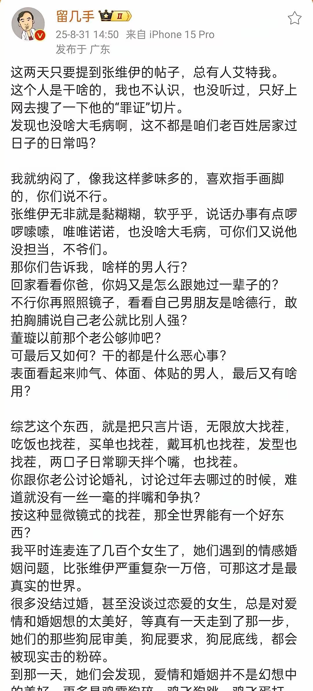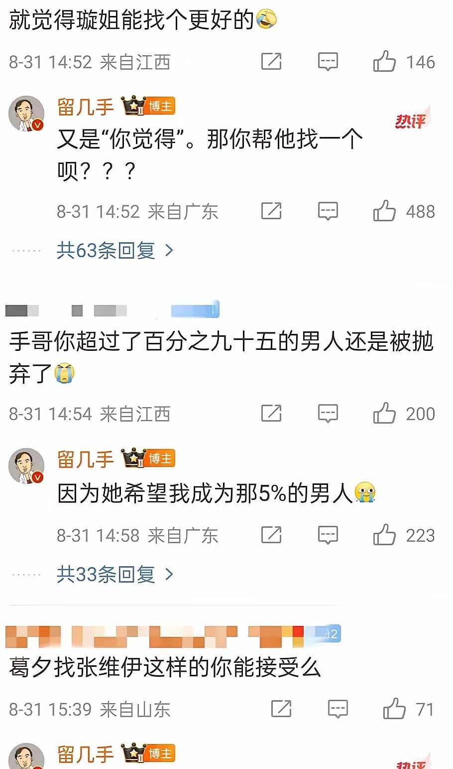 终于看到有人挺张维伊了,那就是留几手,看了他为张维伊发的文,感觉他说的也没什么大毛病。 张维伊比董璇小了将近十岁,就这一条,有多少男的不能接受,有的男的,比自己大那么一岁,可能都接受不了吧,大部分男人可能都是无法接受姐弟恋的。 但是张维伊不一样,他却 轻松的越过了这道坎,跟美丽有钱的董璇在一起,哪怕她有个近十岁的女儿,那又如何? 张维伊能找到董璇,说明他很聪明,总比娶一个不知名的素人强吧,他的名气不是很大,找董璇首先能助力他事业的发展,况且董璇对他的确很好,他是能感觉到的。 再说了,前面还有秦昊,不是也娶了自己的童年女神伊能静吗??比自己不是也大了差不多有十岁了吧,人家现在过的也很幸福,还有张伦硕,找了钟丽缇,直接躺平,不是也很好吗? 再说了,张维伊现在事业爬坡阶段,如果董璇能帮助他,那他是很容易起飞的,而且董璇还愿意生二胎,到时候张维伊那可真的是爱情事业双丰收了,何乐而不为呢? 还是留几手眼光犀利,敢于给张维伊正名,他说的没毛病,大家说是不是?