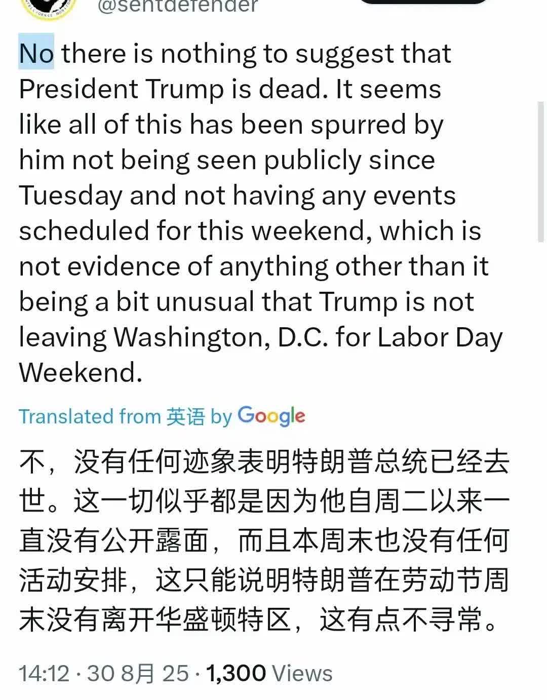 美国网友都在传川普去世了,谣言也落到川普头上了,原因就是川普的手背淤青了,白宫说太多人跟他握手导致的,然后引发关于川普身体健康的讨论,然后关键时刻万斯跑出来说自己做好准备接替总统职务了,因为世事难料,而且自己一直在接受当总统的培训,然后川普周末休假,两天没看到人,社交平台也没有更新,美国网友就开始猜测川普是不是已经去世了,谣言马上就来了,刚刚看到美媒辟谣了,说川普跟孙女去高尔夫球了!