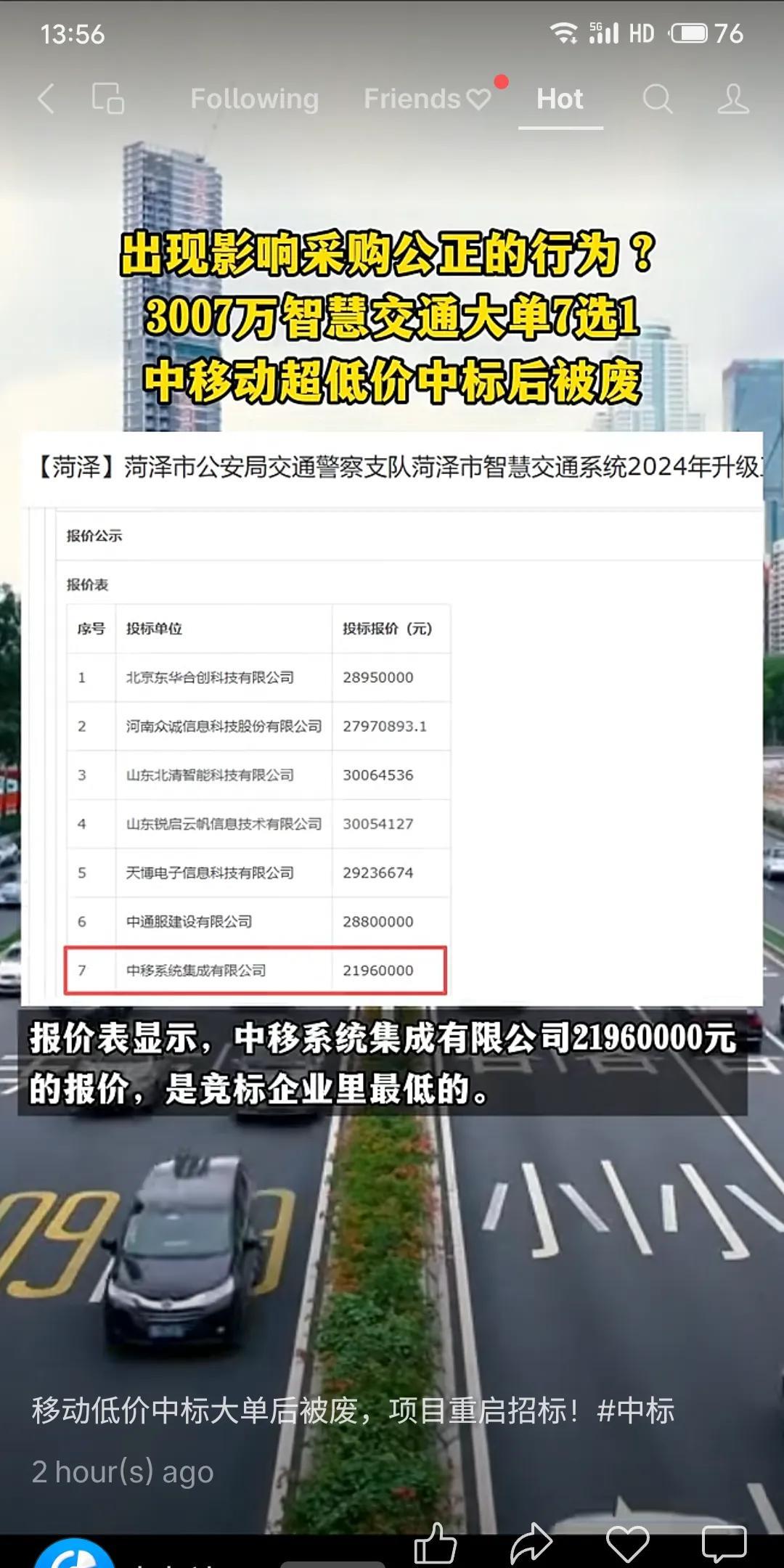 菏泽市智慧交通系统升级项目公布招标结果,中移系统集成有限公司以最低报价约2196