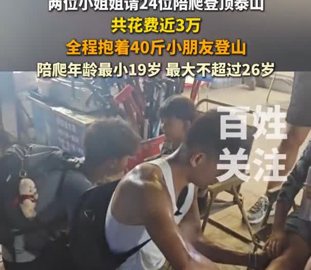 这真是有钱任性!山东,两名女子想要带孩子爬泰山,又担心孩子的身体吃不消,干脆用钱开道,直接请了24位小伙陪爬,全程接力抱着孩子上了玉皇顶,甚至从始至终,孩子的脚都没有落地过! 根据一位陪爬的小伙介绍,两名小姐姐一共花了30000元,其中24位陪爬中,最小的又19岁,最大的也没超过26岁,他们全程接力,抱着40斤的孩子上山,其余人又是拎行李,又是扇扇子,甚至还帮忙捏脚 对家长来说,这次花钱算是买了一个“轻松无忧”的登山体验。只不过,这种方式一出来,争议也少不了。有人觉得这是任性,有人觉得挺实在,毕竟花钱买服务,本身没毛病 说起来,现在确实越来越多服务可以“购买”了,从代排队、代遛狗,到陪诊、陪爬……只要你愿意出钱,好像什么都能找到人帮忙 泰山一路都有抬轿服务的“挑山工”,但一般也就是抬大人。这次是专门组了个小队抬孩子,还配了后勤,说这是“私人定制”也不过分 有网友说这样孩子得不到锻炼,爬山本该是锻炼意志力的机会,家长却把困难全扫清了 但我觉得,每个人选择的生活方式不同。有人愿意花钱买轻松,也有人愿意亲力亲为吃苦磨炼。没有绝对的对错,只是看个人选择