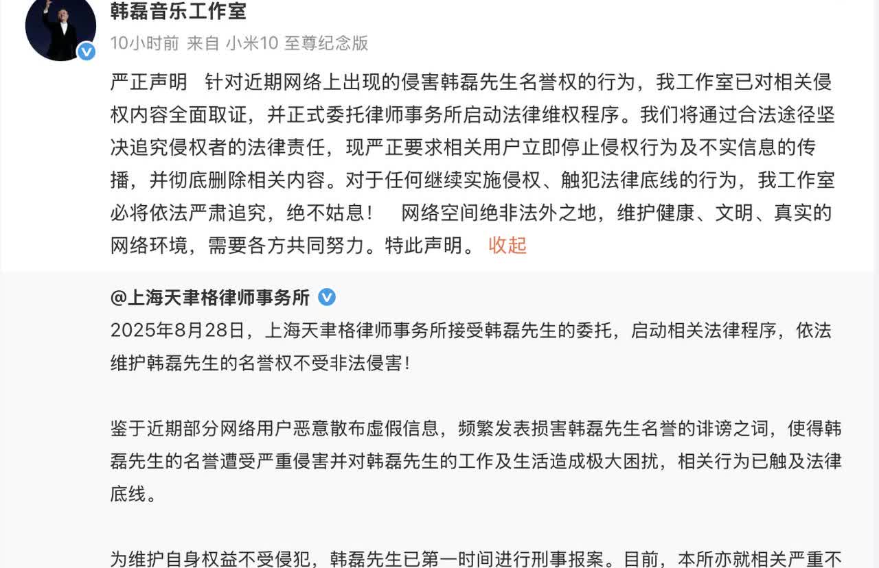 造谣韩磊出轨当事人发长文道歉,称自己出身农民没文化无力对抗。 近日,一女子发文自称怀上了韩磊的孩子,引起轩然大波,该女子当时信誓旦旦的表示自己给韩磊花了很多钱,怀了他的孩子,并且对方还是婚内出轨,不仅如此,更是假冒韩磊的妻子连线造谣。紧接着韩磊方发布声明,表示要追究造谣女子的刑事责任,而该女子也发长文道歉,称自己没文化,看到造谣的那些话觉得很好玩,没想到造成了这么大的影响。不过有不少网友都觉得这道歉声明不对劲,越看越像阴阳怪气韩磊,什么出身农民无力对抗,韩磊先生怎么会和我好呢等等。只能说造谣一张嘴辟谣跑断腿,后续就看韩磊会不会继续追究该女子的刑事责任了。