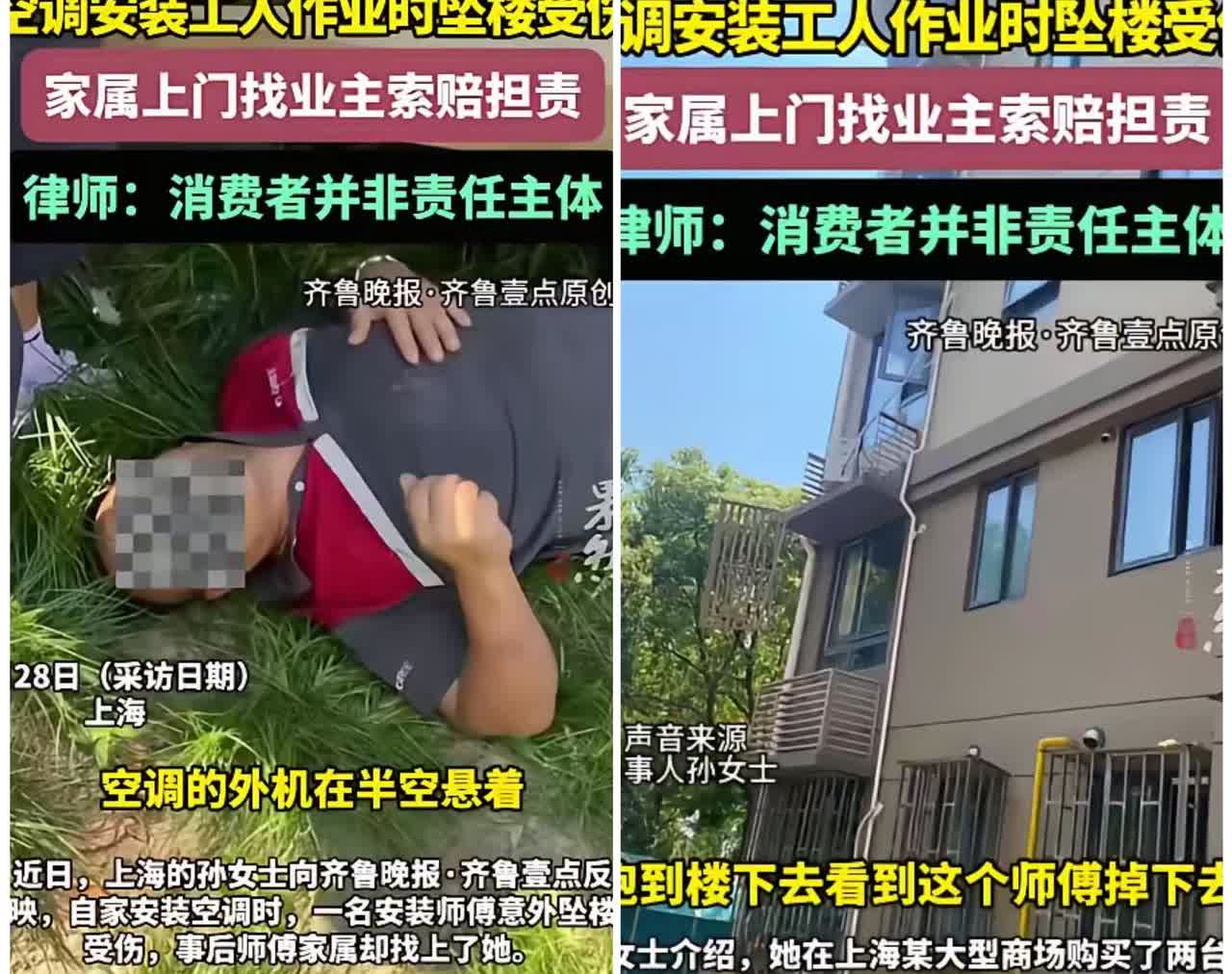 “这跟我有什么关系?”上海,女子在商场买了两台空调,师傅上门安装当天,女子在屋里就听“砰”的一声,过去查看发现一位安装工人意外从3楼坠落。 ——后来才知道,人压根没系安全带,现在还在ICU躺着。 更闹心的在后头,家属找不到商场和品牌兜底,转头就往孙女士家跑,一趟趟上门讨说法,好好的日子全被搅乱了。 她自己也懵啊,明明是正规商场买的,品牌说包安装,订单上又写商场负责,真出了事,两边全成了“甩手掌柜”,连句准话都没有。 其实这事掰扯清楚了,孙女士真没多大责任。你想啊,她是花钱买空调和安装服务的,又不是自己雇人干活,师傅是商场或品牌派来的,那劳务关系就摆在那儿,干活时出意外,理应由雇人的一方担责。只要孙女士没瞎指挥,没给人提供啥危险环境,凭啥让她背锅? 但反过来想,这事也给咱们所有人提了个醒:别觉得“正规渠道”就啥都不用管了。以后买家电、搞装修,只要涉及上门服务,哪怕销售说得再好听,也得把“谁负责安装”“出了事找谁”这些话,要么写进合同,要么聊天记录存好。 不是咱多疑,是真遇到事了,这些纸片子才是能帮你摘清关系的硬证据。 你说这事儿要是摊在自己身上,第一反应得是啥?换作你,除了报警叫救护车,还会提前做些啥来保护自己?