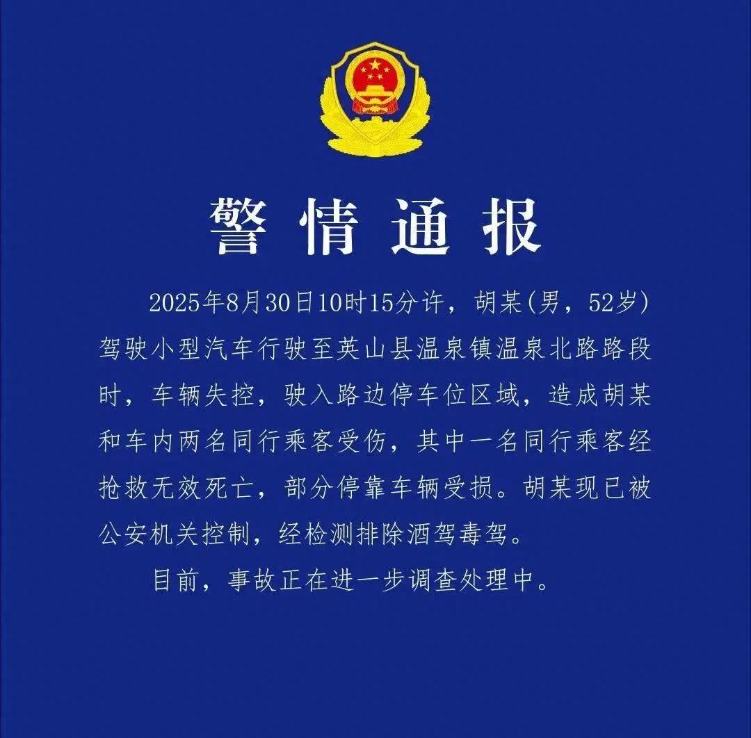 【52岁男子驾车失控致1死2伤,警方通报】湖北省英山县公安局发布警情通报:2025年8月30日10时15分许,胡某(男,52岁)驾驶小型汽车行驶至英山县温泉镇温泉北路路段时,车辆失控,驶入路边停车位区域,造成胡某和车内两名同行乘客受伤,其中一名同行乘客经抢救无效死亡,部分停靠车辆受损。胡某现已被公安机关控制,经检测排除酒驾毒驾。目前,事故正在进一步调查处理中。详戳→https://mp.weixin.qq.com/s/j4VFZHznmTX9rM3ScetHjg