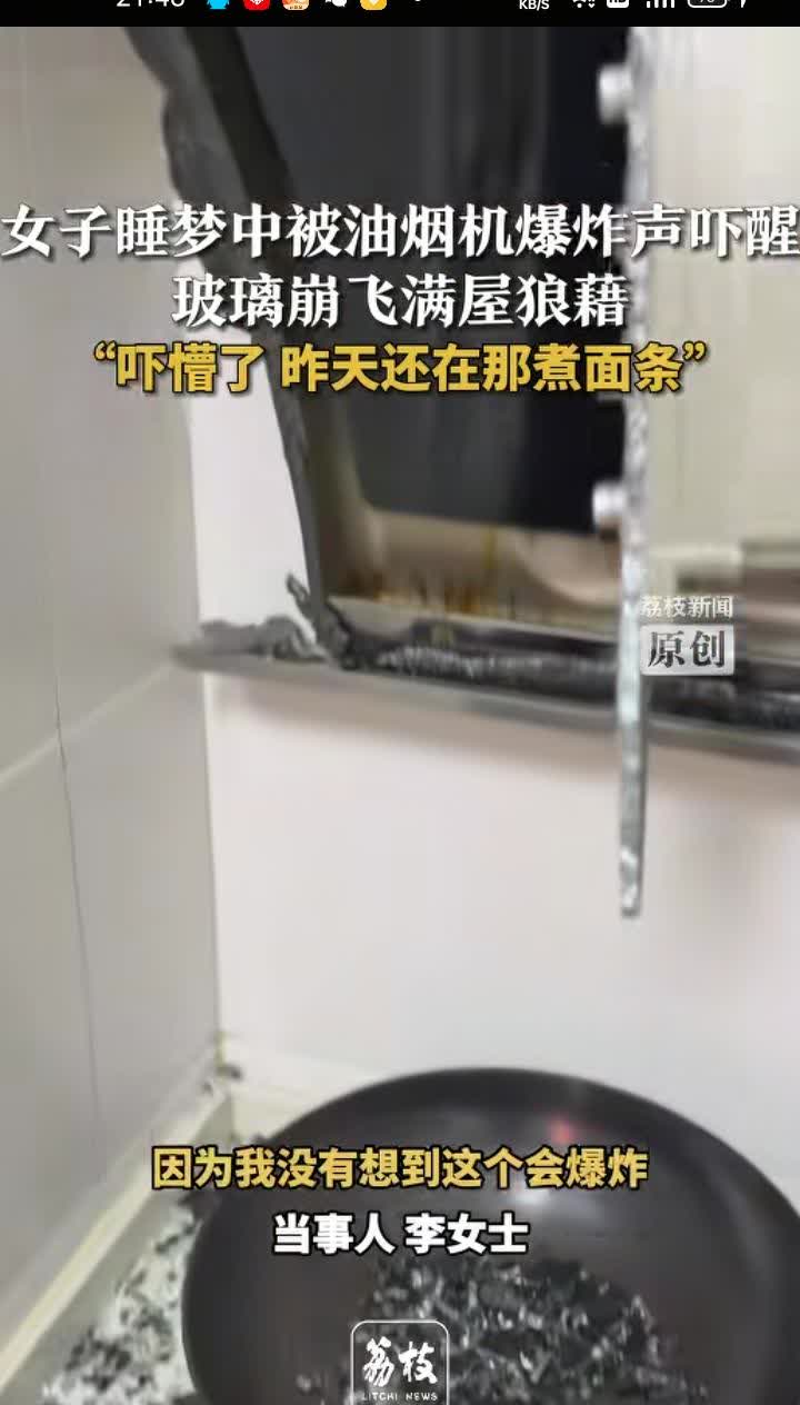 8月31日,保定市安新县。女子晒视频称,自己睡觉时突然“啪”一声巨响被炸醒,还以为什么东西掉地上了,进厨房一看,是抽油烟机爆炸了,满地都是玻璃渣。 当事人李女士介绍称,售后说油烟机过了质保,整机质保一年,使用年限是八年,油烟机大概是2017年购买的。